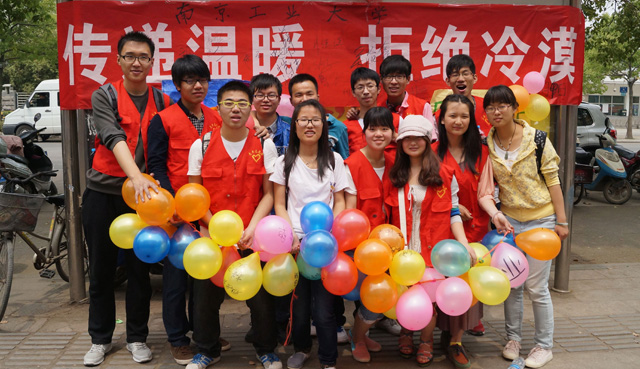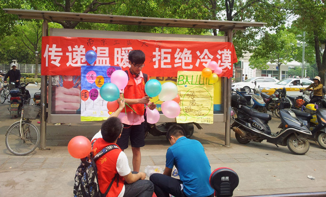 上午8点,全体人员在校门口全数集合,活动正式开始。本次主题活动共分为两个部分。首先,由青协部员在学校内收集各级学生们对他人的关爱物语,并将它们写在气球上;其次,由青协部员将这些温暖的祝福分发给社会各界的人民群众,代表我校用积极行动去温暖他人。部员共分为两组,一组去浦口区苏果购物中心,另一组则到浦口区蔬菜批发超市。活动气氛分外高涨,广大市民也积极参与其中,人们在欢声笑语中感受彼此最真挚的祝愿。同时我院青协巧遇南审青协举办雅安慈善捐款活动,在彼此合影留念中共同感受同学们的情真意切。