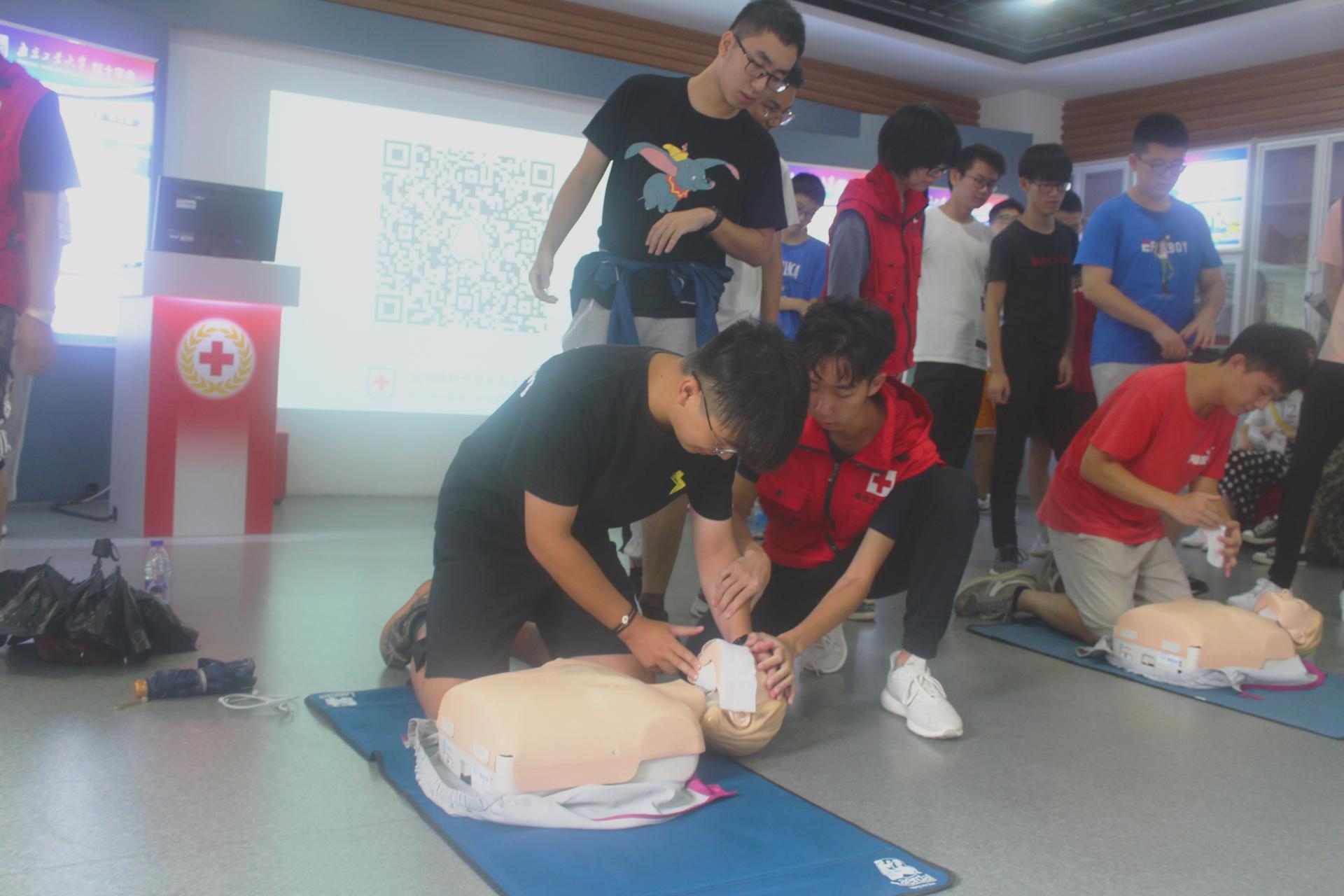 活动开始,校红十字会成员在同和楼513教室为新生讲授了应急救护知识,分发了相关书籍。接着,志愿者又带领新生参观了红十字知识区、创伤救护区、红十字工作展示区等三个展区。最后,新生走进实际模拟区观看了心肺复苏的操作视频,并跟随红十字会成员实际学习了心肺复习的相关操作。