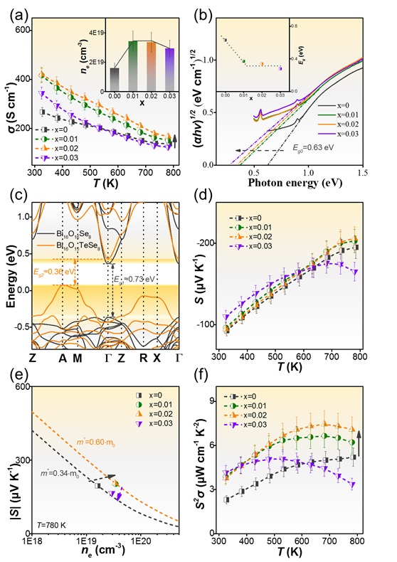 王一峰教授课题组根据二维材料的解理特性,通过家用破壁机在液相中高速剪切Bi2O2Se多晶粉末,发现所制备的纳米片状Bi2O2Se经过烧结,电导率得到显著提升(常温下最高可达到500~600 Scm-1),这主要得益于Bi2O2Se经剪切沿着Se层解理,产生大量的Se空位,并在体系内产生大量电子。热电性能也由此得到明显改善。ACS Appl. Mater. Interfaces 2019, 11, 21603−21609