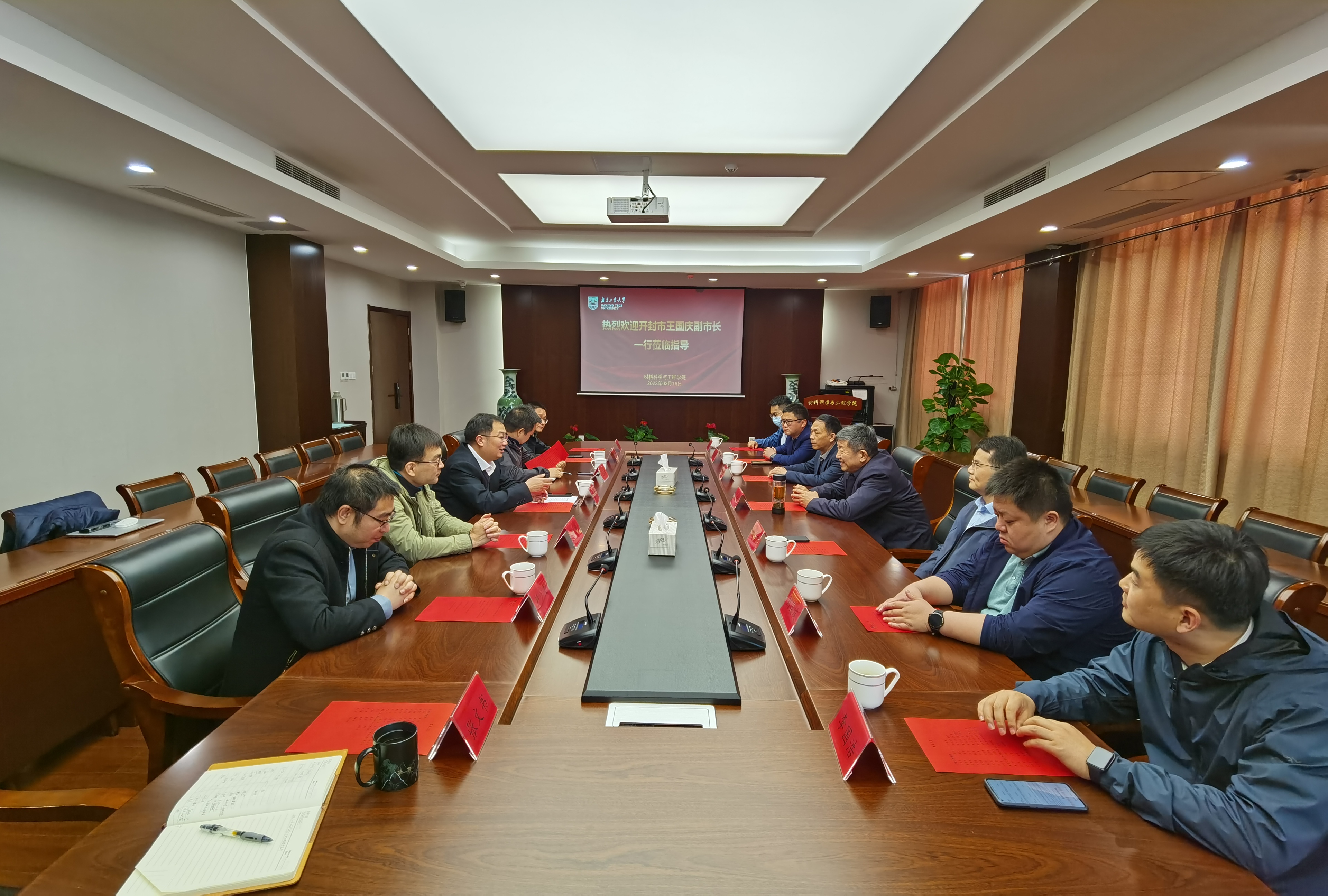 3月16日上午,开封市政府副市长王国庆率队禹王台区副区长谢昌旭、开封清研新材料研究院有限公司总经理赵斌一行9人到我院进行调研及交流。学院院长崔升、杨晖教授等出席了交流会议,副院长沈岳松主持会议。