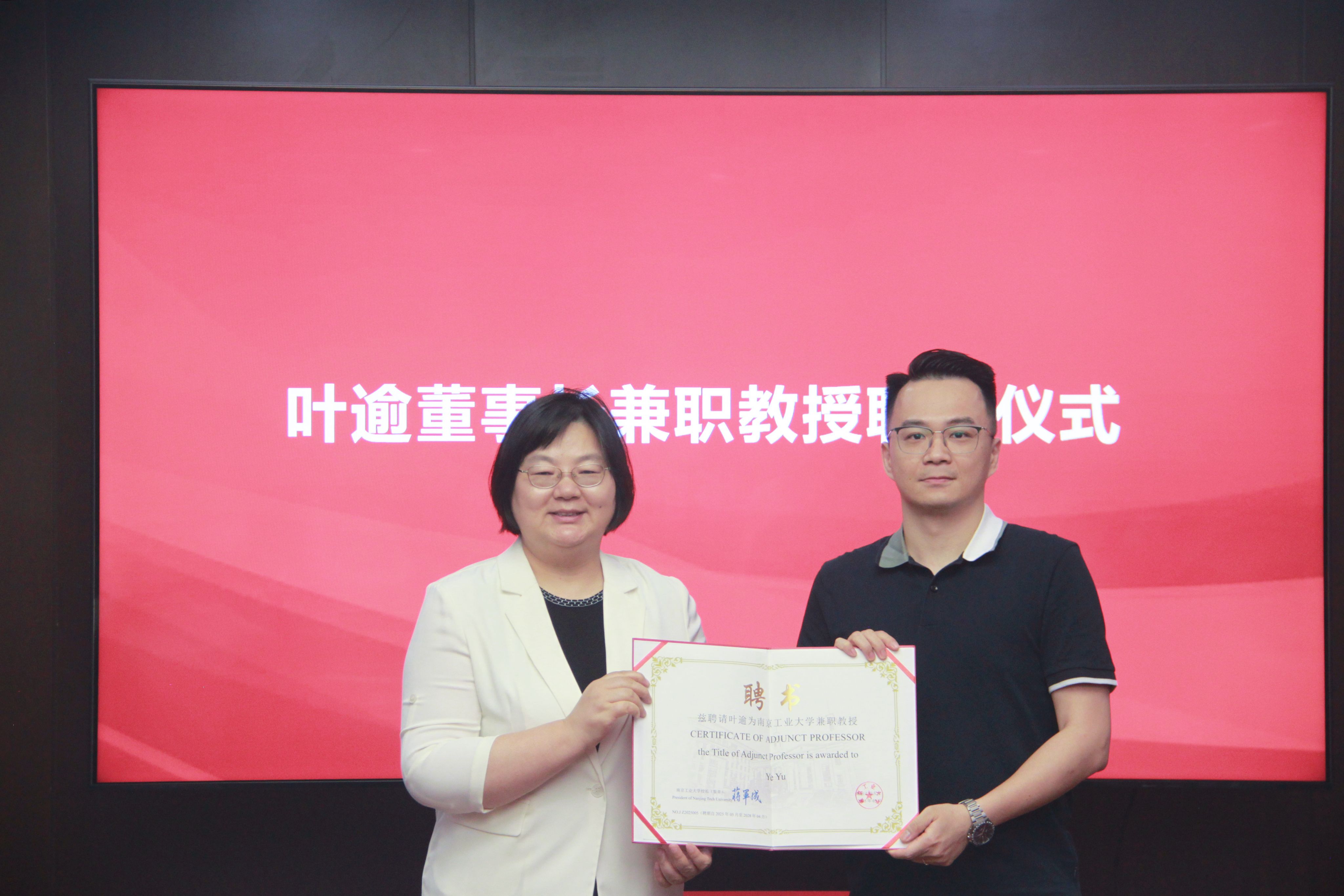 随后举行了叶逾兼职教授聘任仪式,人事处处长王曙光介绍了叶逾的成长经历和卓越成绩。夏侃代表学校为叶逾颁发兼职教授聘书。叶逾在发言中表示将发挥产业优势,支持学校人才培养工作。