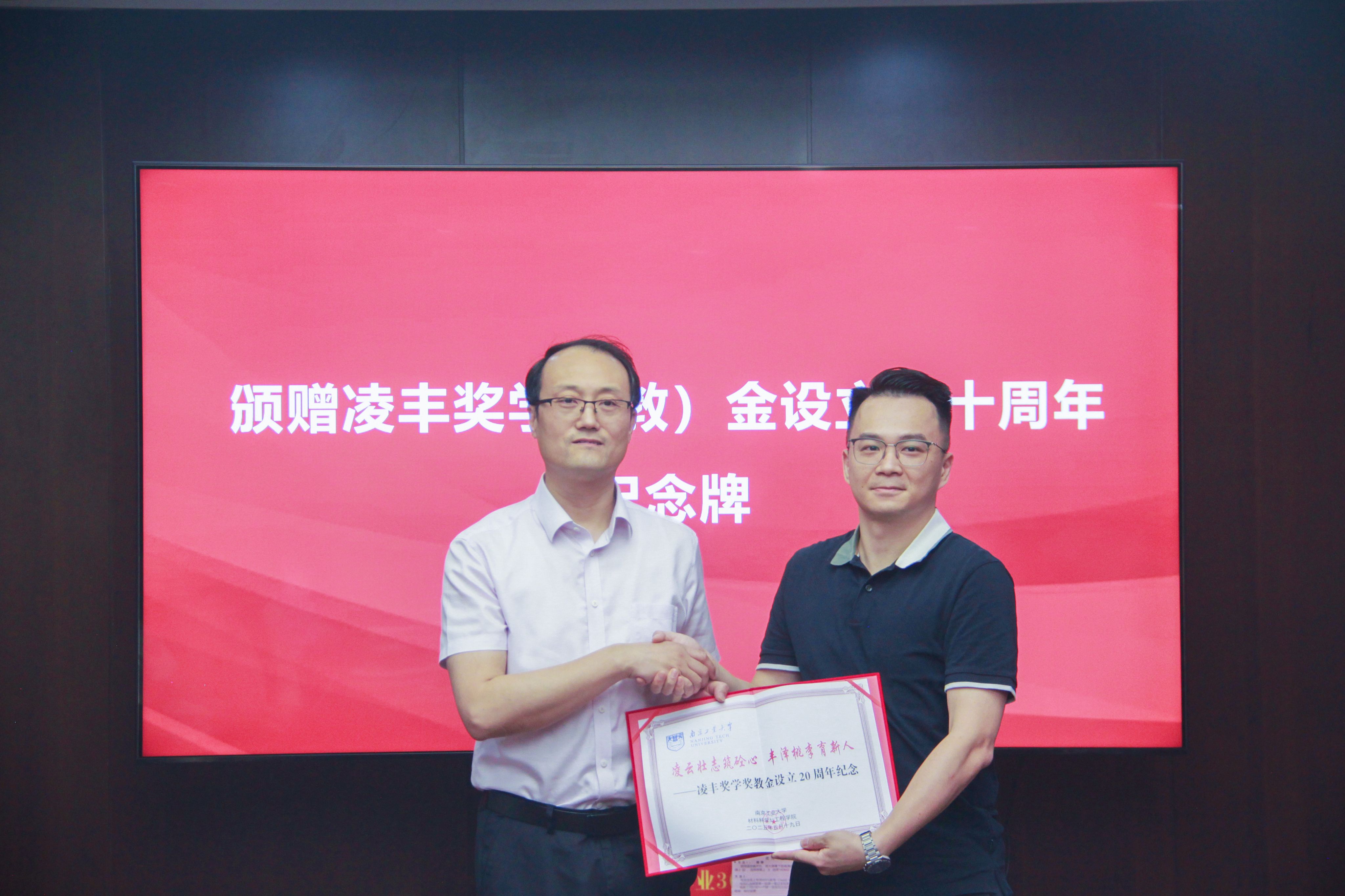 刘大卫、关工委常务副主任高明向凌丰集团颁发了“凌丰奖学奖教金设立二十周年”纪念证书和纪念画。