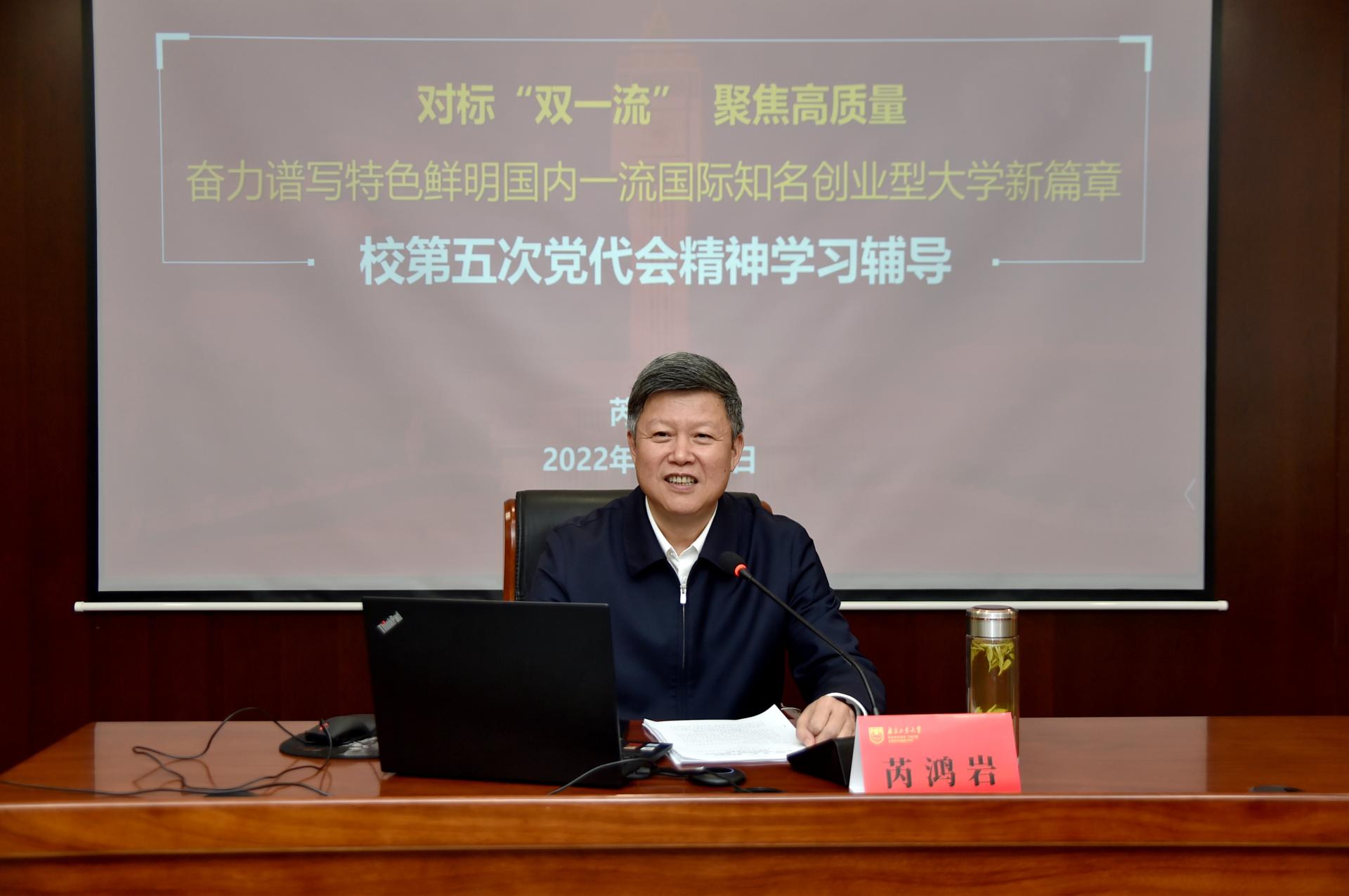 芮鸿岩书记围绕大会主题介绍了校第五次党代会召开的背景意义、筹备和召开情况,从工作回顾、奋斗目标、主要任务、党的建设四个方面对党委工作报告进行了详细解读。他指出,经过全体师生多年的共同努力,学校党的建设全面加强,创业型大学建设成效显著,办学水平和综合实力持续提高,社会影响力和美誉度不断提升。芮书记结合大会确立的“特色鲜明国内一流国际知名创业型大学”战略目标、任务要求、思路举措进行了深刻阐述。他强调,一分部署、九分落实,蓝图已经绘就,关键要狠抓落实,真抓实干。各单位各部门要认真学习宣传贯彻学校第五次党代会精神,认真制定方案,精心组织实施,逐项细化重点任务,对标“双一流”,聚焦高质量,奋力谱写特色鲜明国内一流国际知名创业型大学新篇章。