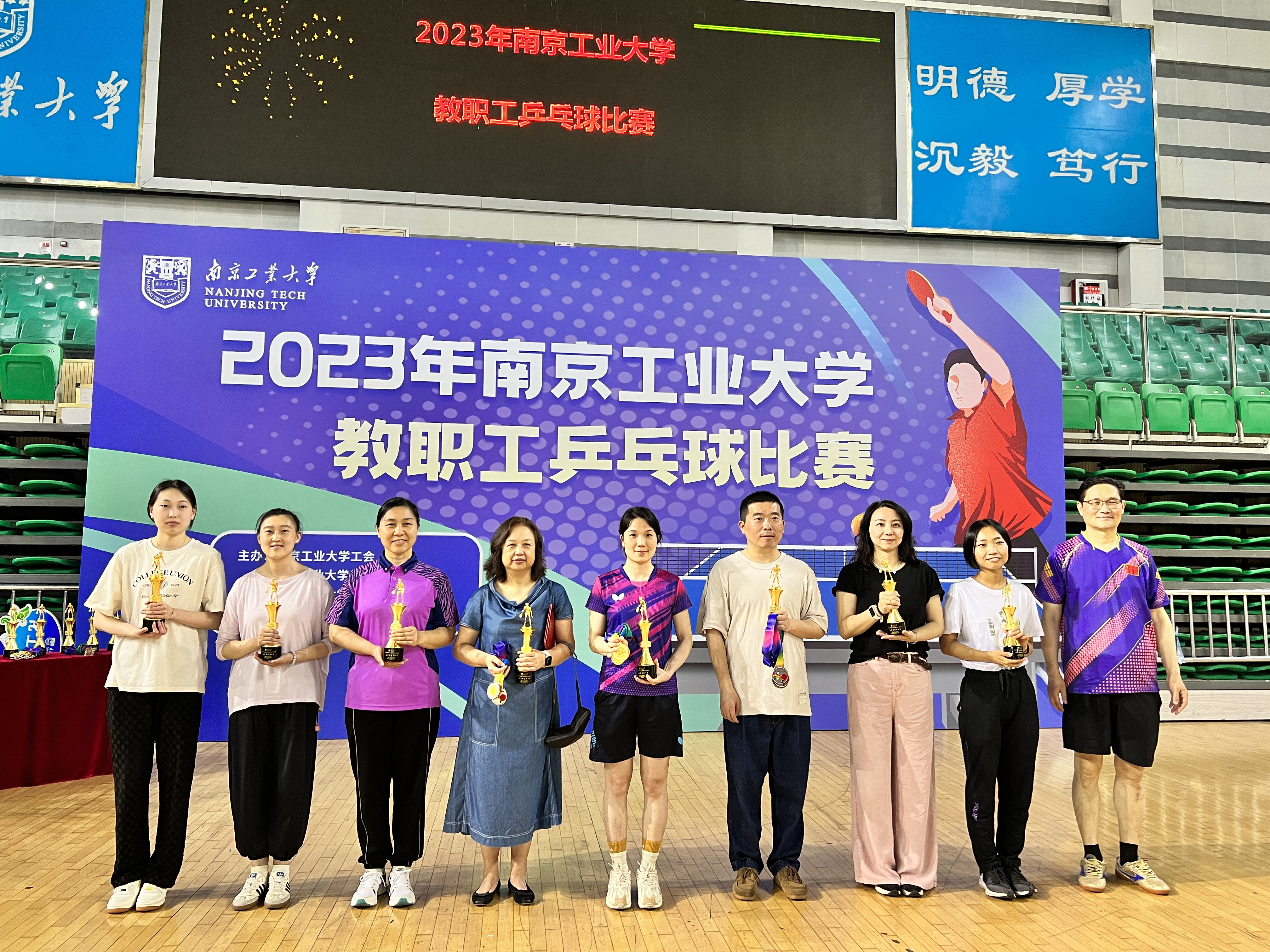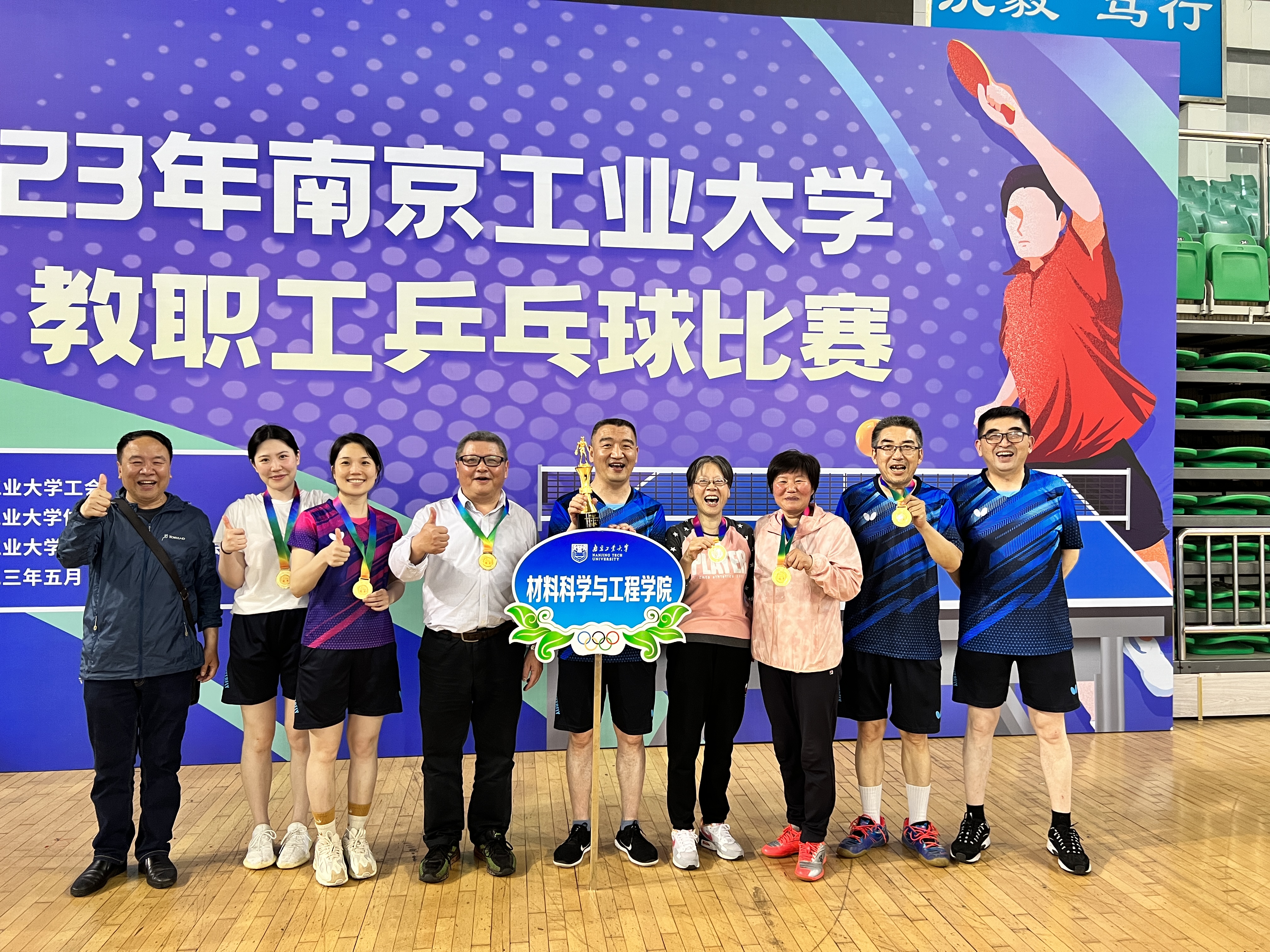 5月27日,2023年太阳成集团tyc234cc教职工乒乓球比赛在江浦体育馆举行,来自全校26个单位的球队参加了比赛。经过一整天的竞赛,由沈春英、赵芳霞、何一燕和过昕彤老师组成的材料学院女子乒乓球队在小组赛中,凌厉果断,以全胜的循环赛战绩,位列小组第一名并出线。在前八名的淘汰赛和其后的前四名淘汰赛中,一路高歌、所向披靡,完胜对手。最后,材料学院女队与离退休处女队会师冠亚军决赛。在冠亚军决赛中,材料学院女队顶住压力,顽强拼搏,再次实现不输一局、不丢一场的成绩。最终,以全部比赛全胜的战绩夺冠。这是材料学院第一次夺得全校乒乓球比赛冠军,创造了材料学院乒乓球比赛的新辉煌。