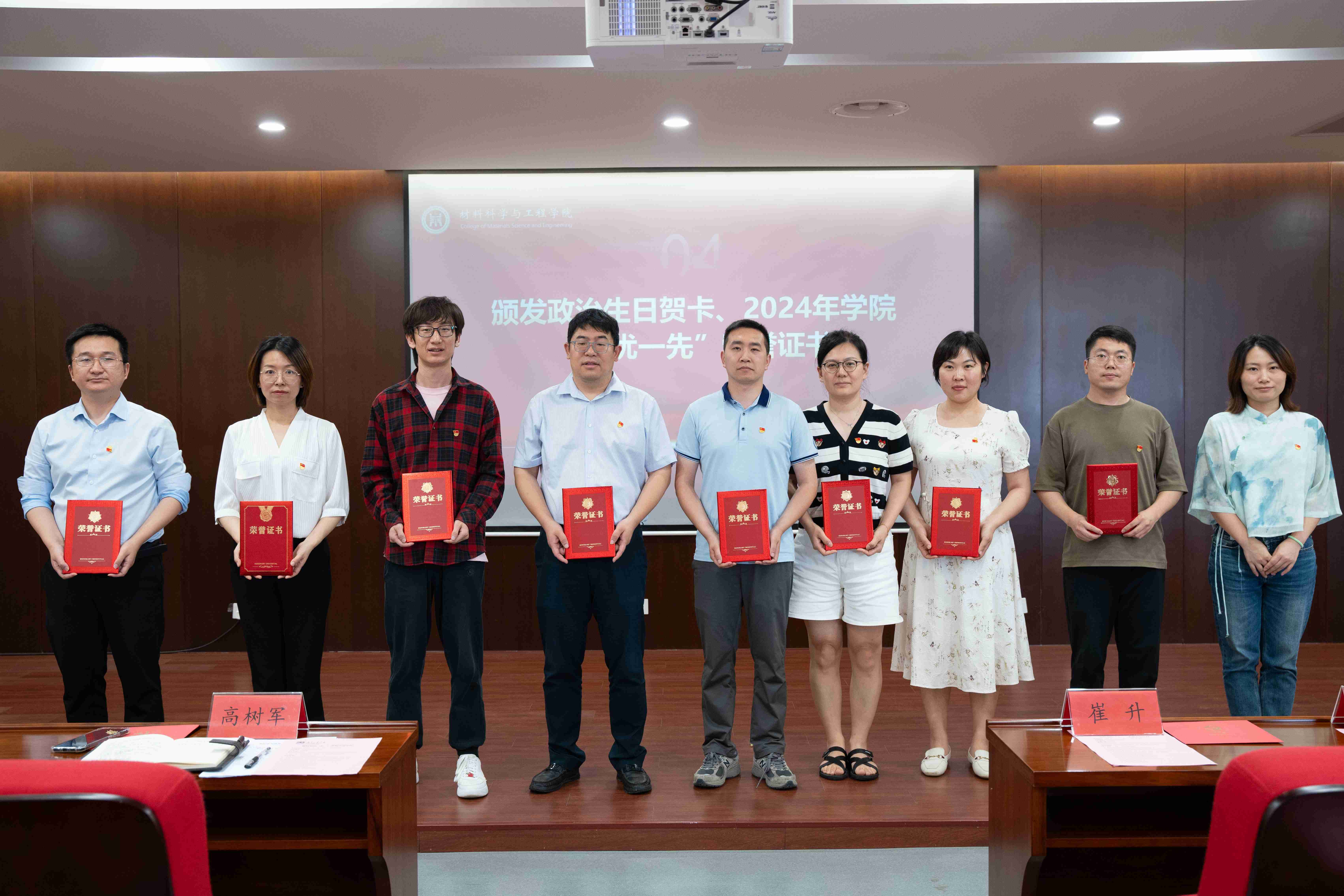 为庆祝中国共产党建党103周年,激励先进党员和党支部充分发挥示范引领作用,不断增强基层党组织战斗力和凝聚力,推动党纪学习教育走深走实,7月1日下午,tyc234cc 太阳成集团党委在润德楼B512会议室召开“七一”表彰大会暨党员集体政治生日会。学院党委委员、师生党支部书记和委员、2024年学院“两优一先”获奖代表等参加会议。会议由党委副书记石防震主持。
