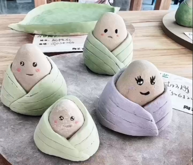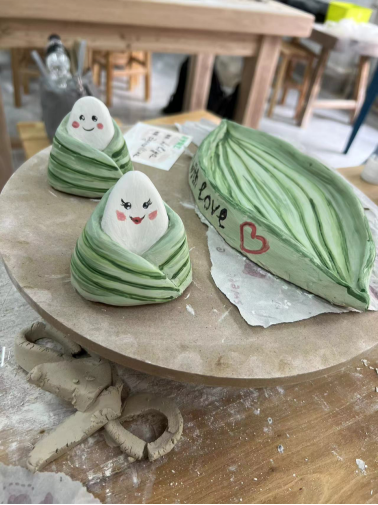 陶艺老师通过逐步示范和详细讲解,展示了粽子小摆件及粽叶形盘子的制作流程。参与者们热情高涨,亲身体验了从擀泥、压泥、束泥,到捏造型、拉线,再到表面干燥,最后上色的整个制作过程。每位参与者都制作出了独具特色的陶艺作品,这些作品将在自然晾干、喷釉后进行烧制成瓷。