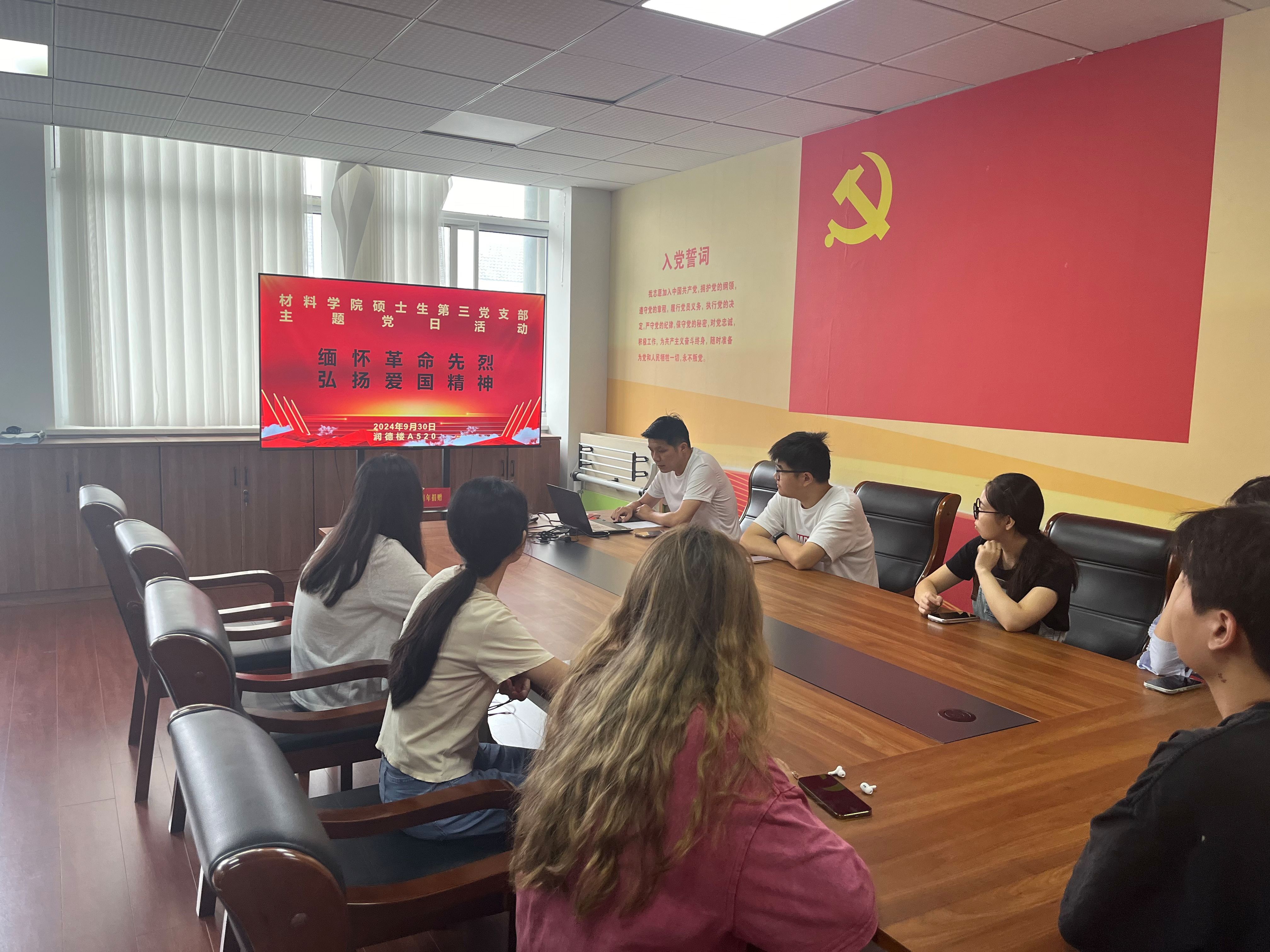 鲜花献英烈,浩气壮山河。2024年9月30日是我国第11个烈士纪念日,为深切缅怀革命先烈,传承红色基因,tyc234cc 太阳成集团硕士生第三党支部于9月30日上午在润德楼A520开展“缅怀革命先烈,弘扬爱国精神”主题党日活动。支部全体党员参加。