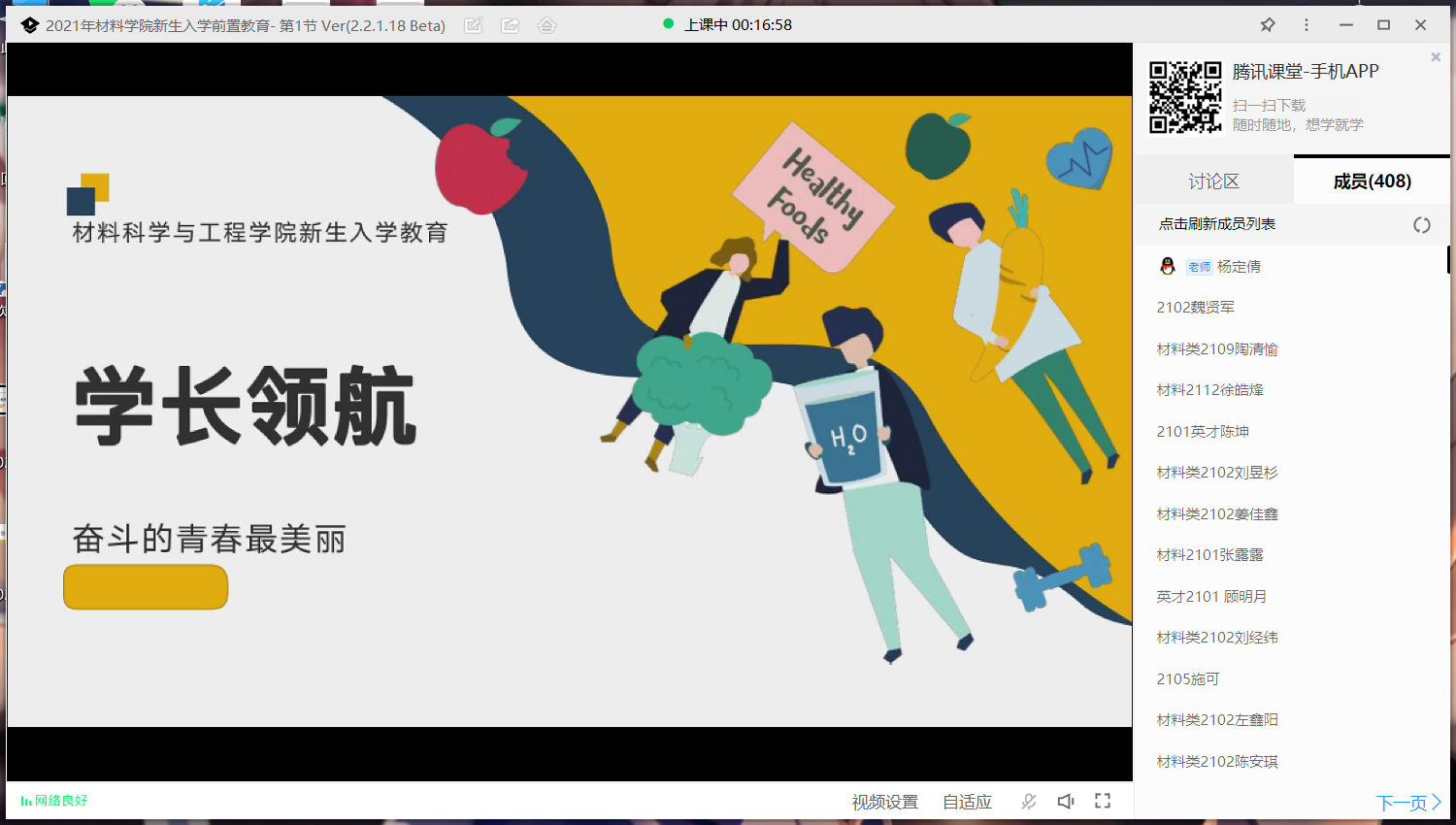 为引导材料学院2021级新生尽快适应大学学习和生活环境,增强同学们的集体荣誉感和归属感,营造积极进取,严谨求实的优良学风。2021年9月9日,新生辅导员金蓓蓓、优秀学生代表为2021级400余名新生开展了入学教育第一讲,课程在线上腾讯课堂平台进行。