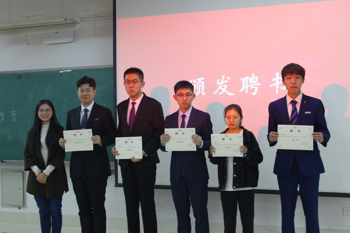 会议开始,戴惠老师致开幕词,她对学生组织新成员的加入表示热烈的欢迎,并对新学年的学生组织工作充满期待,希望每位成员增强团队合作意识,锻炼自己各方面的能力,逐步完善自己。接着,学生会执行主席芮子庆详细布置了本年度学生组织的各项工作,并宣布学院第二十一届学生组织正式成立。随后,部长代表王彦策和材青代表王小如依次发言,分享了他们一个月来的工作体会,鼓励大家积极认真地工作。最后,戴惠、王琪、颜文三位团委老师为学生组织的主席团和部长团颁发了聘书。本次会议在热烈的掌声中圆满落下了帷幕。
