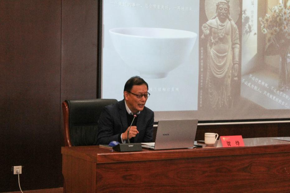 首先,贺烽老师用幽默地口吻讲述了一些有趣的小故事。结合学院特色,从材料的重要性和发展讲起,进而引出每个人看世界都有自己的坐标系,从不同角度入手,会看到不一样的东西的观点。紧接着,贺烽老师以陶艺作品的发展史为线索展示了一件件巧夺天工的陶艺作品,其中着重展示了唐、宋、明、清的代表作品,并声情并茂地讲述了这些陶艺作品的特点、制作工艺、历史以及作品背后所蕴含的文化内涵。讲座最后,石防震副书记寄语广大学生要把专业基础打牢,要做到“学一行,爱一行”。