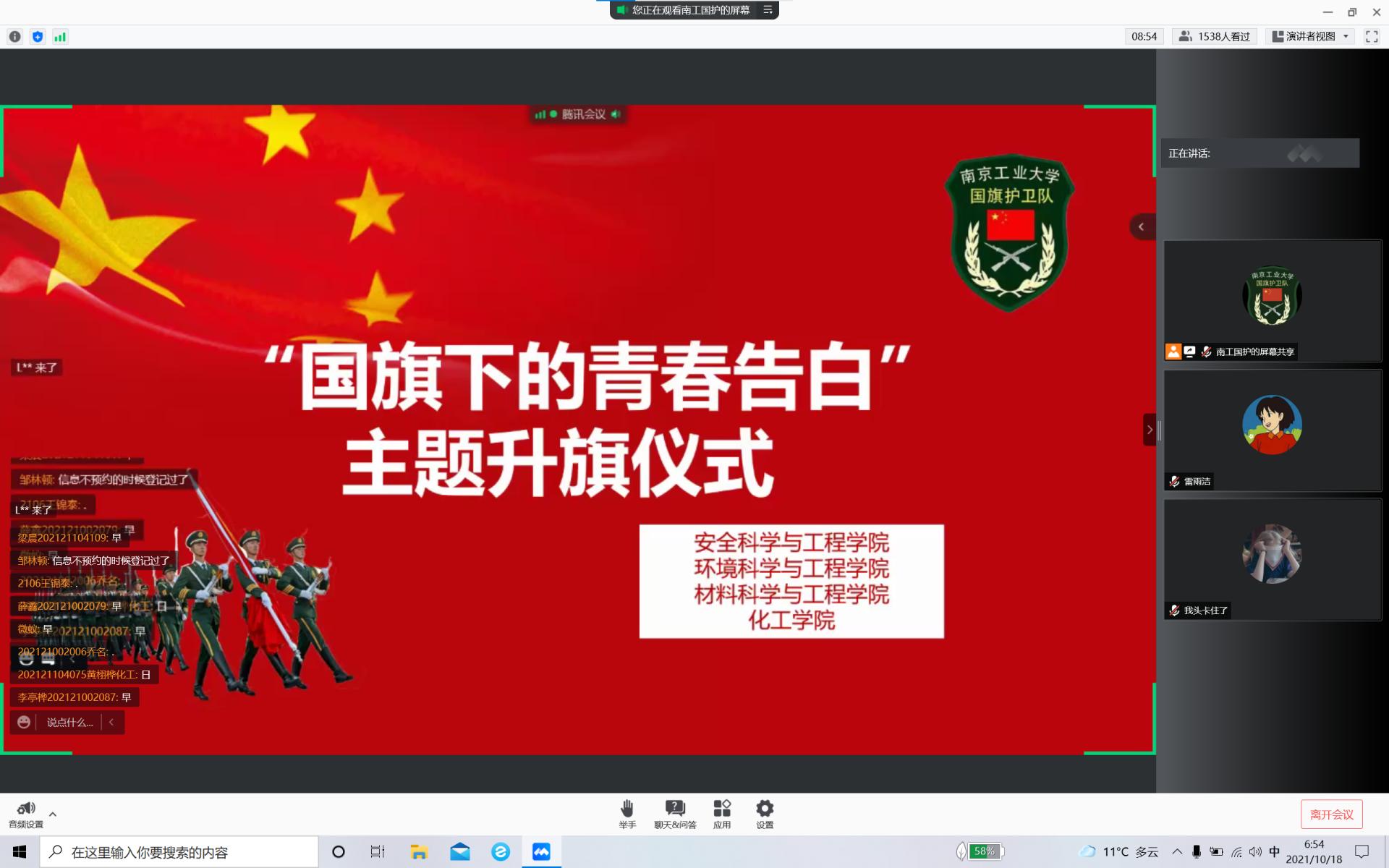 金秋十月,丹桂飘香。2021年10月18日清晨,tyc234cc 太阳成集团、环境科学与工程学院、安全科学与工程学院、化工学院联合举行“国旗下的青春告白”主题升旗仪式。tyc234cc 太阳成集团党委副书记石防震、21级材料学院400余名新同学参加了此次线上升旗仪式。