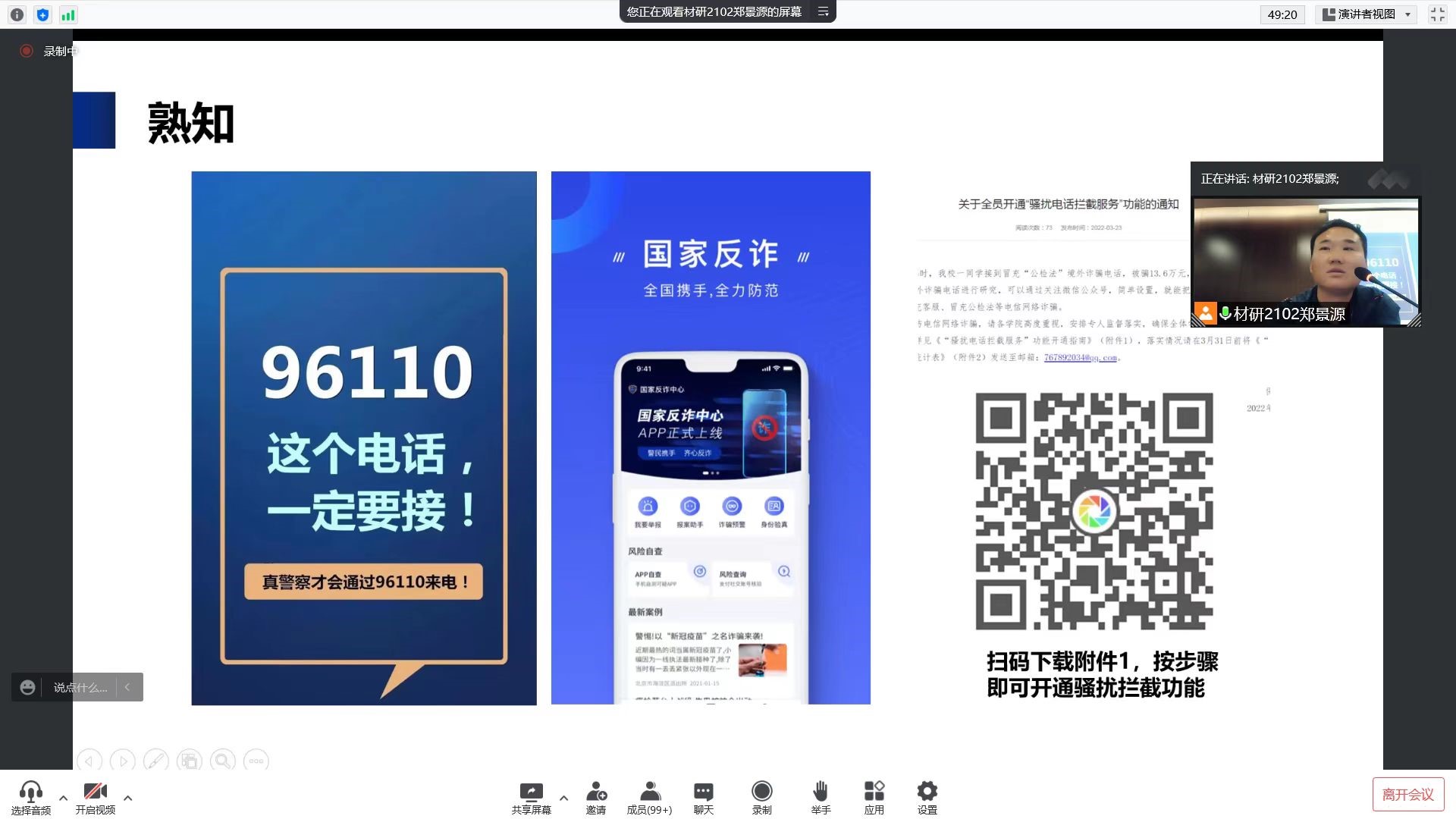 为迎接首届校研究生宿舍文化月的到来,提高同学们的防诈骗意识,5月11日下午,材料学院邀请太阳成集团tyc234cc党委保卫部、保卫处葛凯老师为全院研究生带来了一场防诈骗知识专题讲座,分管院领导及辅导员参加了本次讲座,讲座采用线上线下相结合的方式开展。
