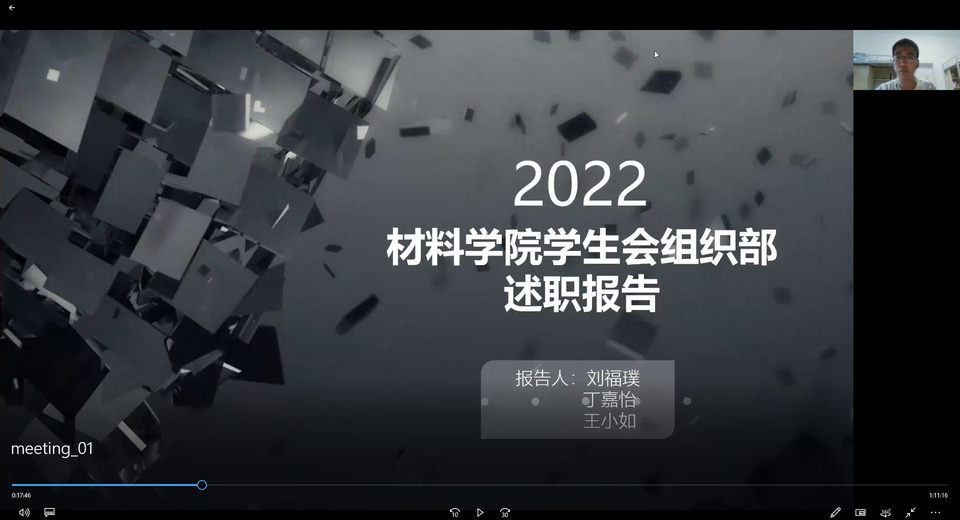 6月22日晚,材料学院第二十二届学生会述职大会在润德楼B511报告厅举行。院党委副书记石防震,分团委书记颜文,辅导员王安全、李诚、彭超以及学生会新老部长团参加本次大会。大会由院学生会主席团成员王毅桢主持。