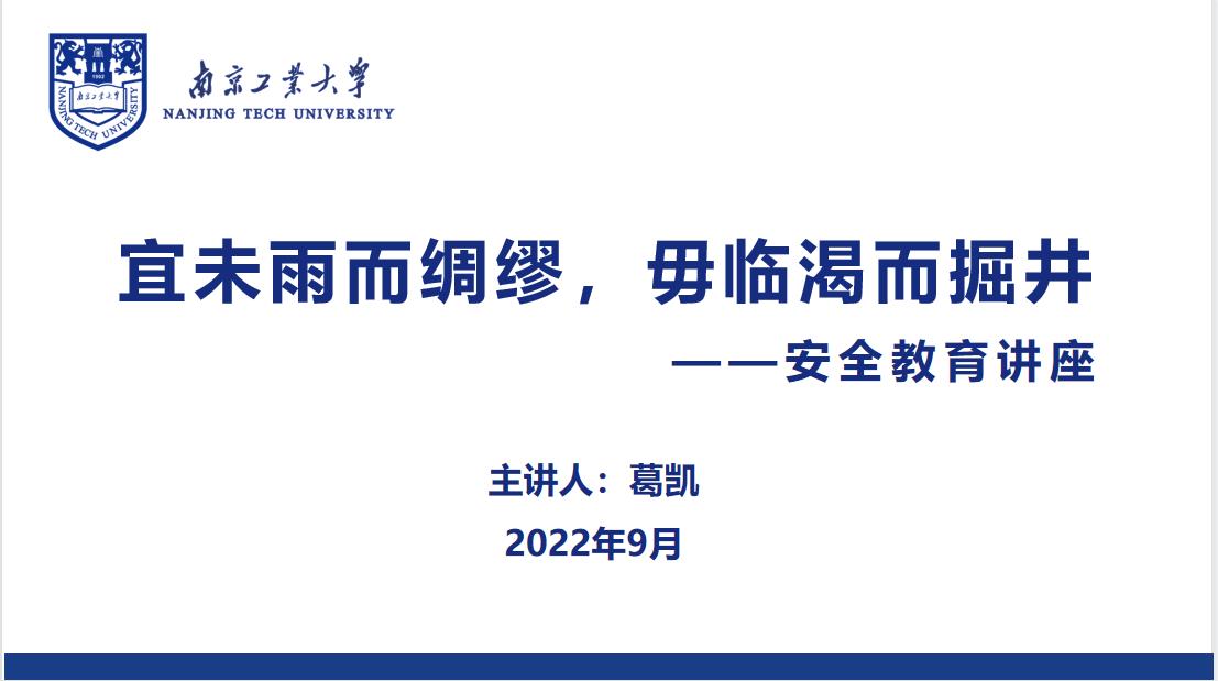 为加强材料学院2022级新生安全教育,提高学生的自我防范意识,在新生入学教育阶段特邀请校园安全部葛凯老师作“宜未雨而绸缪,毋临渴而掘井”主题报告。材料学院全体2022级本科生参加,报告由学院2022级辅导员颜文老师主持。
