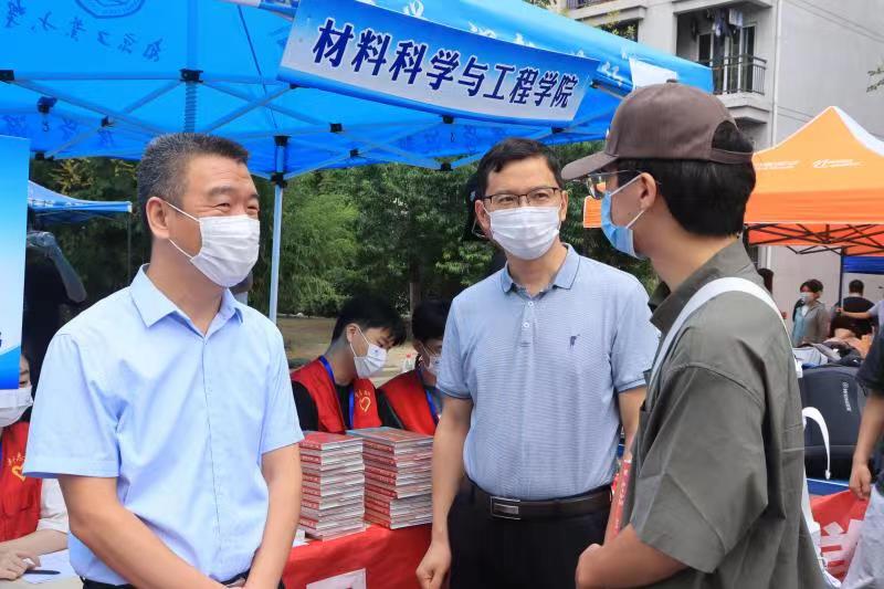 材料学院党委书记高树军、院长陆春华、党委副书记石防震现场指导和参与迎新工作,强调做好疫情防控不放松,确保迎新工作热情周到、安全有序。学院领导先后走访学生宿舍,看望刚刚报到的新生。在学院报到点现场,高树军书记和陆春华院长先后向新同学赠送书籍,鼓励大家在人生的新阶段继续拼搏奋进,追求卓越。