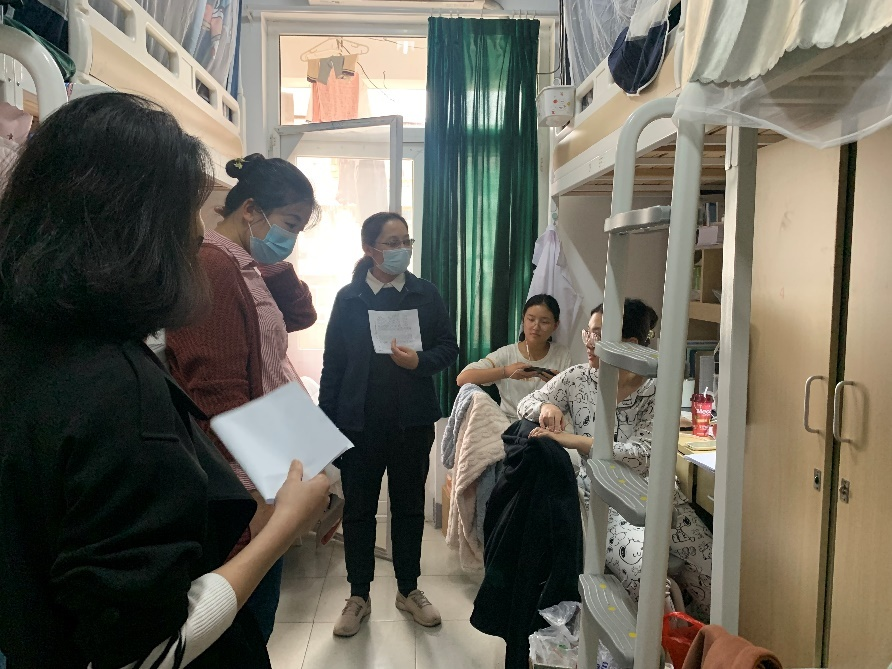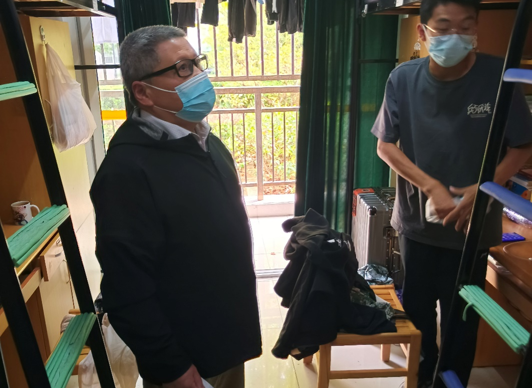 老师们每到一间宿舍,都与同学们进行亲切交谈,详细了解同学们在校园封控期间的思想、学习和生活情况,为同学们分析当前疫情防控形势,讲解学校疫情防控措施和最新要求,细心叮嘱同学们鼓足信心、打起精神,认真落实学校防疫措施,养成良好个人卫生习惯,保持宿舍环境干净整洁,还强调要养成规则规范意识,自觉遵守学校的规章制度。老师们还仔细询问学生校园封控期间的日常饮食、学习、生活安排,听取学生心声,并对学生们关心的问题做了耐心解答。同时对同学们线上学习分别给出了针对性的建议,鼓励大家坚定信心,互帮互助,齐心协力,共克时艰。