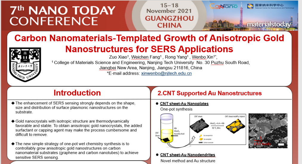 2021年11月15-18日,在Elsevier期刊Nano Today、中国科学院国家纳米科学中心、广东粤港澳大湾区国家纳米科技创新研究院与Elsevier期刊Materials Today联合举办的第七届Nano Today大会上,我院辛文波教授指导的研究生杨荣在“Emerging nanomaterials”分会场进行了口头报告,研究生方伟晨、肖作则分别进行了墙报展示。其中以肖作为第一作者的墙报“Carbon Nanomaterials-Templated Growth of Anisotropic Gold Nanostructures for SERS Applications”在会议117份墙报展示中脱颖而出,荣获最佳墙报奖,是大会评出的6项最佳墙报奖之一,也是“Carbon Nanomaterials”主题唯一获奖墙报。