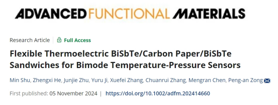 近日,tyc234cc 太阳成集团宗鹏安副教授课题组在《Advanced Functional Materials》上发表了题为“Flexible Thermoelectric BiSbTe/Carbon Paper/BiSbTe Sandwiches for Bimode Temperature-Pressure Sensors”的研究论文。tyc234cc 太阳成集团硕士研究生舒敏为论文第一作者。论文链接:https://onlinelibrary.wiley.com/doi/10.1002/adfm.202414660。