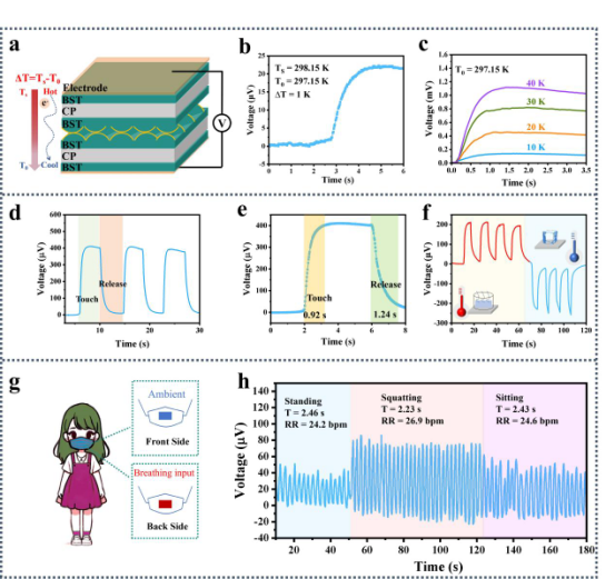 温度/压力双模式传感器在个人健康监测、可穿戴电子和机器人信号检测等方面具有重要应用前景。传统的双模式传感器通常是将两个功能独立的传感器集成在一起,这导致了制造及系统的复杂性。本研究基于电沉积技术制造了三明治结构的铋锑碲/碳纸/铋锑碲薄膜,通过垂直堆叠开发了一种新型温度/压力双模式传感器。该传感器展现了出色的温度敏感性,能够检测低至1 K的温差,响应时间为0.92秒。基于其热电效应,传感器实现了自供电传感,能够感应手指触摸和呼吸状态。同时,其岛状接触表面在压力作用下能迅速改变接触电阻,确保了出色的压力敏感性,响应时间为0.17秒,能够检测各种人体行为,包括肢体动作和微表情。此外,该薄膜器件在柔性、电磁屏蔽、焦耳加热性能等方面表现优异,有望应用于健康监测、可穿戴电子、人工智能等领域。