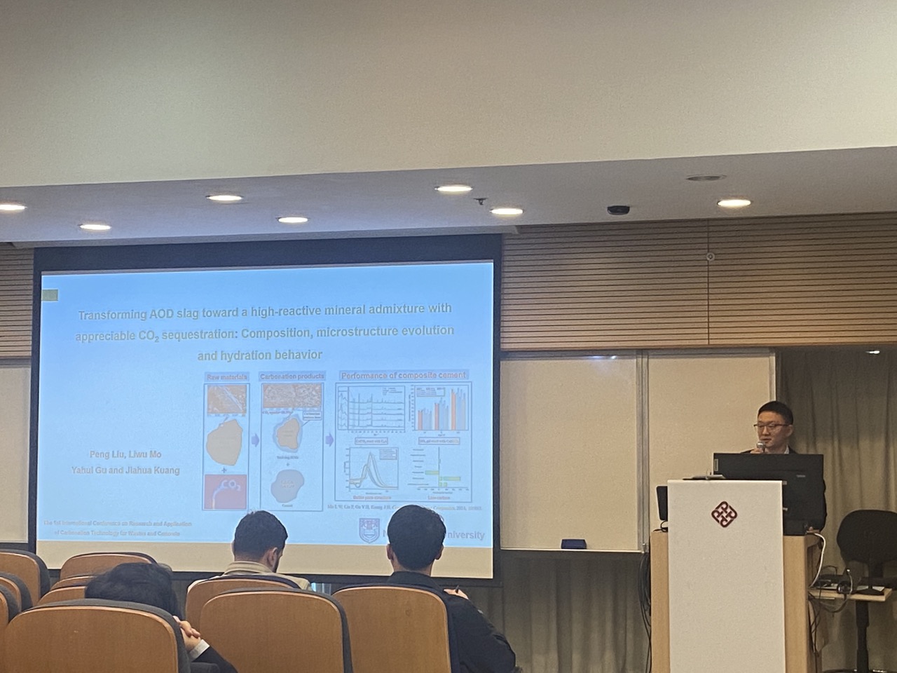 我院博士后刘朋也作了题为《TransformingAOD Slag toward a High-Reactive Mineral Admixture with Appreciable CO2Sequestration: Composition, Microstructure Evolution and Hydration Behavior》的口头报告,介绍了将AOD钢渣转化为高反应性矿物掺合料同时矿化固定CO2的最新进展。博士生徐茂淳作了题为《Preparation of Carbon-negative Artificial Lightweight Aggregates by Carbonating Sintered Red Mud (SRM): CO2Sequestration, Microstructure and Performance》的口头报告,分享了利用烧结法赤泥制备负碳人工轻骨料的研究成果。