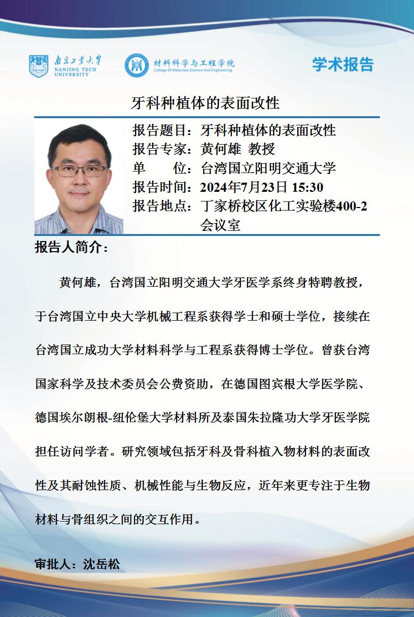黄何雄,台湾阳明交通大学牙医学系终身特聘教授,于台湾中央大学机械工程系获得学士和硕士学位,接续在台湾成功大学材料科学与工程系获得博士学位。曾获台湾国家科学及技术委员会公费资助,在德国图宾根大学医学院、德国埃尔朗根-纽伦堡大学材料所及泰国朱拉隆功大学牙医学院担任访问学者。研究领域包括牙科及骨科植入物材料的表面改性及其耐蚀性质、机械性能与生物反应,近年来更专注于生物材料与骨组织之间的交互作用。