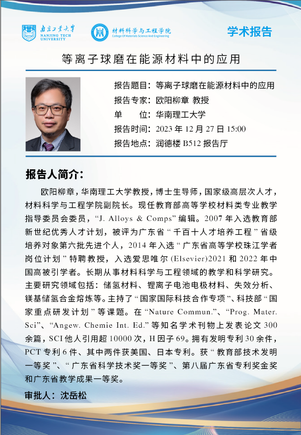 欧阳柳章,华南理工大学教授,博士生导师,国家级高层次人才,tyc234cc 太阳成集团副院长。现任教育部高等学校材料类专业教学指导委员会委员,“J. Alloys & Comps”编辑。2007年入选教育部新世纪优秀人才计划,被评为广东省“千百十人才培养工程”省级培养对象第六批先进个人,2014年入选“广东省高等学校珠江学者岗位计划”特聘教授,入选爱思唯尔(Elsevier)2021和2022年中国高被引学者。长期从事材料科学与工程领域的教学和科学研究。主要研究领域包括:储氢材料、锂离子电池电极材料、失效分析、镁基储氢合金熔炼等。主持了“国家国际科技合作专项”、科技部“国家重点研发计划”等课题。在“Nature Commun.”、“Prog. Mater. Sci”、“Angew. Chemie Int. Ed.”等知名学术刊物上发表论文300余篇,SCI他人引用超10000次,H因子69。拥有发明专利30余件,PCT专利6件、其中两件获美国、日本专利。获“教育部技术发明一等奖”、“广东省科学技术奖一等奖”、第八届广东省专利奖金奖和广东省教学成果一等奖。