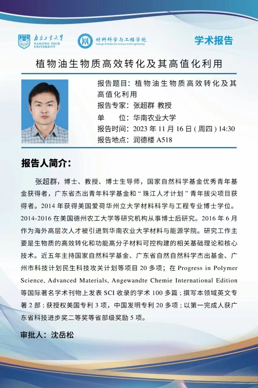 张超群,华南农业大学、材料与能源学院。博士、教授、博士生导师,国家自然科学基金优秀青年基金获得者,广东省杰出青年科学基金和“珠江人才计划”青年拔尖项目获得者。2014年获得美国爱荷华州立大学材料科学与工程专业博士学位。2014-2016在美国德州农工大学等研究机构从事博士后研究。2016年6月作为海外高层次人才被引进到华南农业大学材料与能源学院。研究工作主要是生物质的高效转化和功能高分子材料可控构建的相关基础理论和核心技术。近五年主持国家自然科学基金、广东省自然自然科学杰出基金、广州市科技计划民生科技攻关计划等项目20多项;在Progress in Polymer Science, Advanced Materials, Angewandte Chemie International Edition等国际著名学术刊物上发表SCI收录的学术100多篇;撰写本领域英文专著2部;获授权美国专利3项,中国发明专利20多项;以第一完成人获广东省科技进步奖二等奖等省部级奖励5项。
