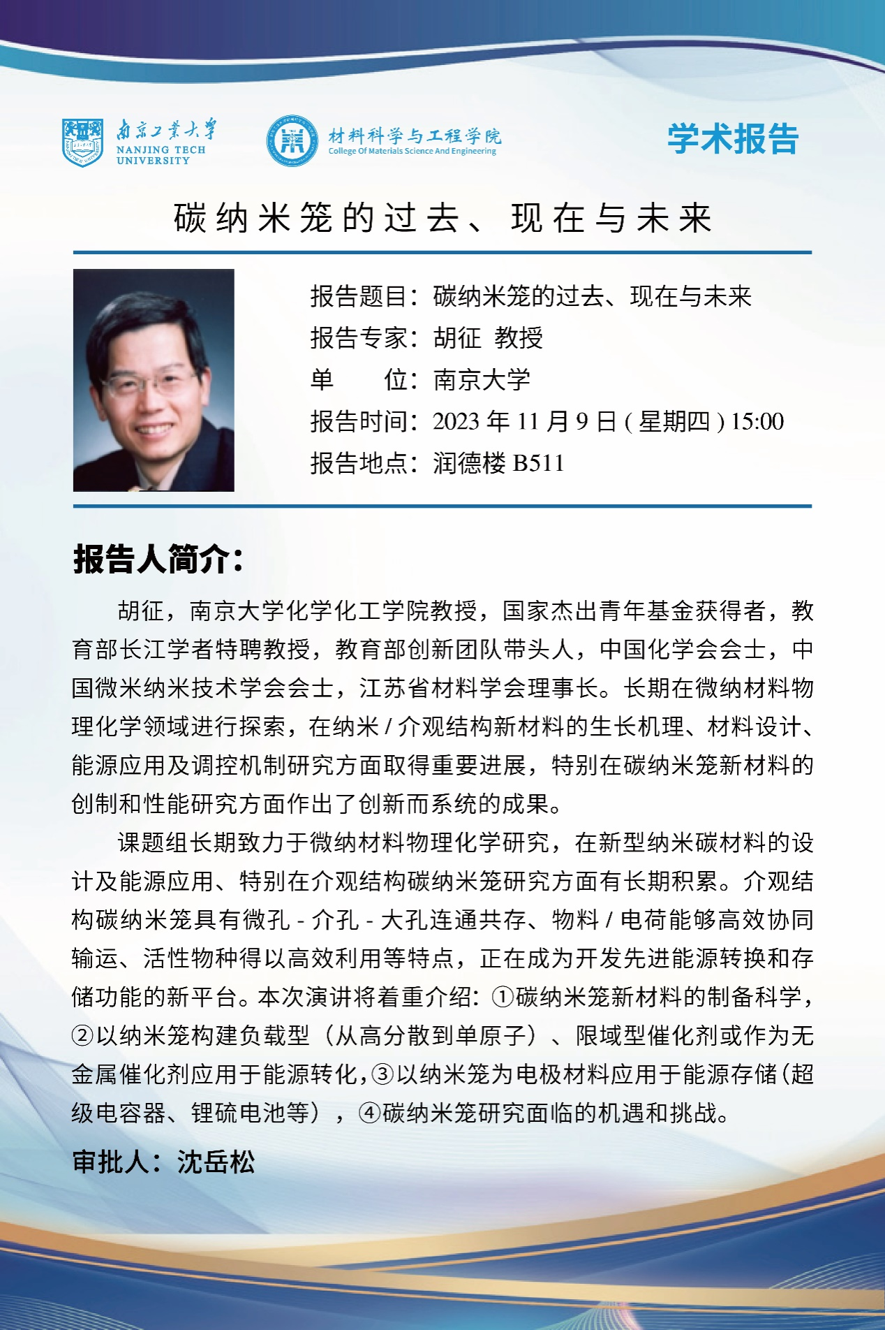胡征,南京大学化学化工学院教授,国家杰出青年基金获得者,教育部CJ学者特聘教授,教育部创新团队带头人,中国化学会会士,中国微米纳米技术学会会士,江苏省材料学会理事长。长期在微纳材料物理化学领域进行探索,在纳米/介观结构新材料的生长机理、材料设计、能源应用及调控机制研究方面取得重要进展,特别在碳纳米笼新材料的创制和性能研究方面作出了创新而系统的成果。