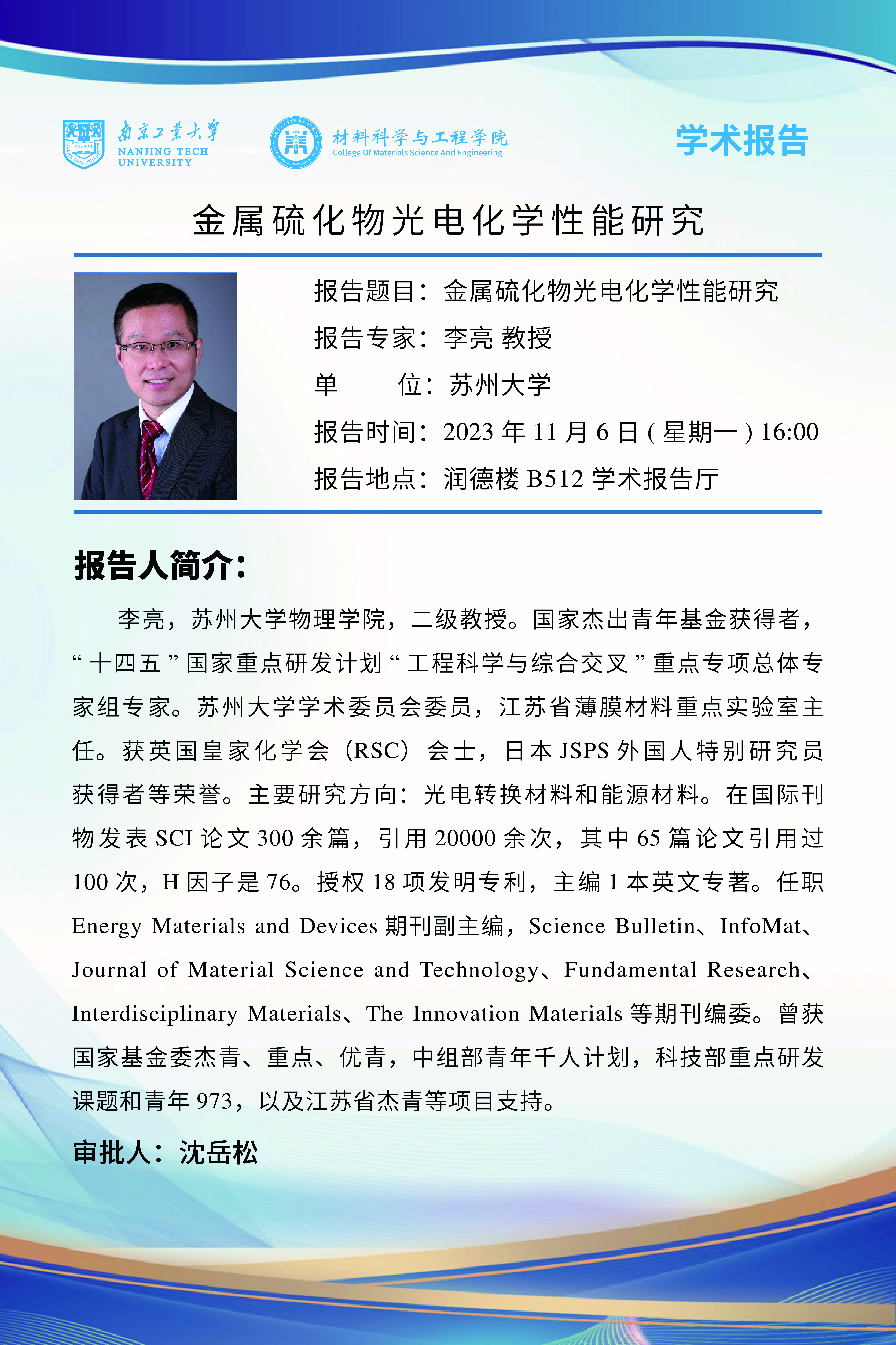 李亮,苏州大学物理学院,二级教授。国家杰出青年基金获得者,“十四五”国家重点研发计划“工程科学与综合交叉”重点专项总体专家组专家。苏州大学学术委员会委员,江苏省薄膜材料重点实验室主任。获英国皇家化学会(RSC)会士,日本JSPS外国人特别研究员获得者等荣誉。主要研究方向:光电转换材料和能源材料。在国际刊物发表SCI论文300余篇,引用20000余次,其中65篇论文引用过100次,H因子是76。授权18项发明专利,主编1本英文专著。任职Energy Materials and Devices期刊副主编,Science Bulletin、InfoMat、Journal of Material Science and Technology、Fundamental Research、Interdisciplinary Materials、The Innovation Materials等期刊编委。曾获国家基金委杰青、重点、优青,中组部QQ计划,科技部重点研发课题和青年973,以及江苏省杰青等项目支持。