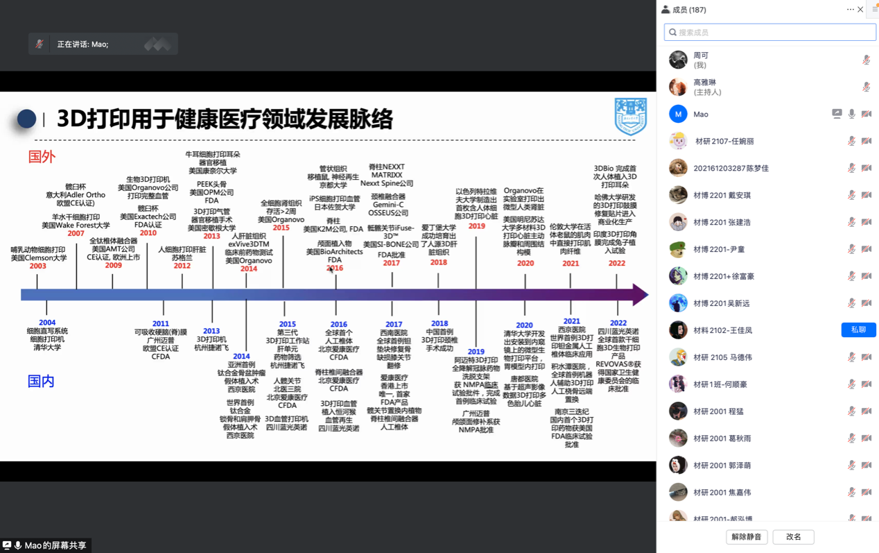 首先,毛宏理教授作了以“生物3D打印墨水材料研发与应用”为主题的报告。讲述了近年来生物3D打印的重要发展,介绍了生物3D打印墨水材料的分类与构建,以明胶、透明质酸、海藻酸钠等天然材料为例,描绘了墨水材料在创伤修复、体外器官模型构建以及药物筛选中的应用。