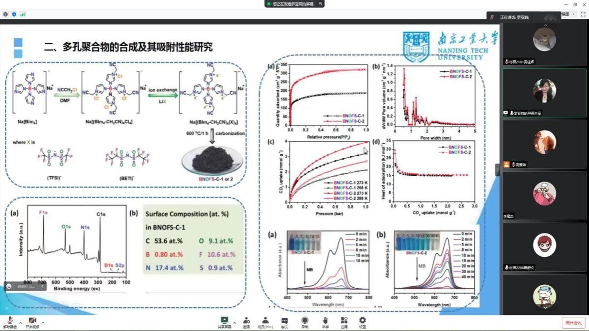 最后,罗亚莉副教授作了以“超级海绵-多孔有机聚合物的制备与吸附性能研究”为主题的报告。介绍了多孔聚合物种类及其特性,以课题组近期研究成果为例,展示了含不同杂原子和负载金属纳米催化剂的多孔聚合物制备过程及其广阔的应用前景。