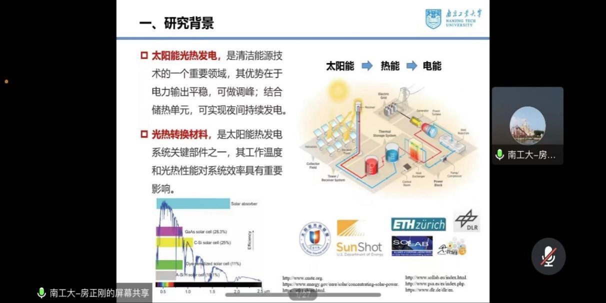 随后,房正刚副教授作了以“耐高温光谱选择性吸收陶瓷及其能量转换应用”为主题的报告。介绍了高温光谱选择性吸收陶瓷的相关工作及研究成果,从能量转换的方面描绘了其应用场景,并对未来太阳能光吸收材料的发展做出了展望。