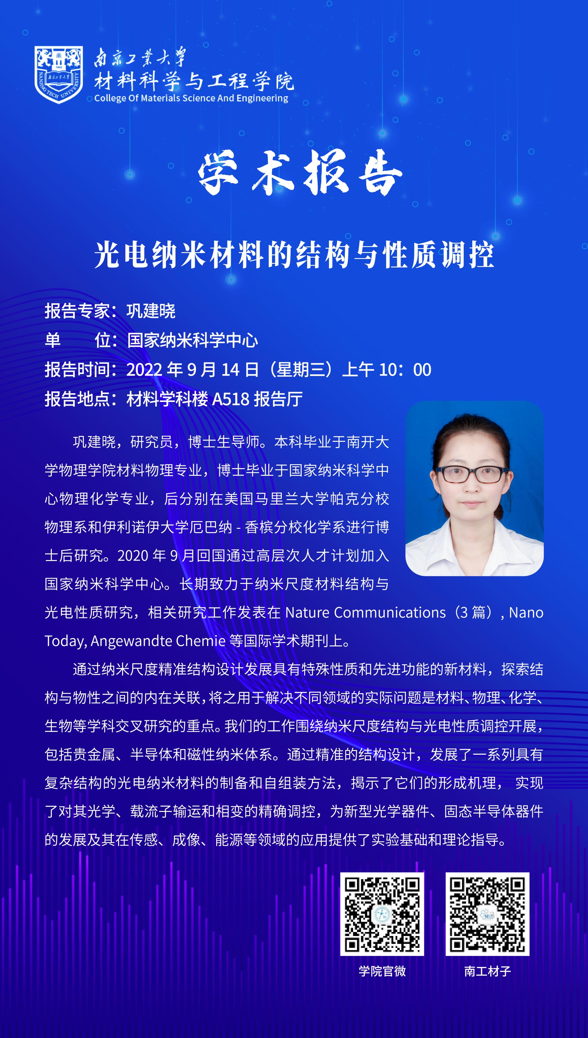 【邀请报告】国家纳米科学中心巩建晓研究员--光电纳米材料的结构与性质调控