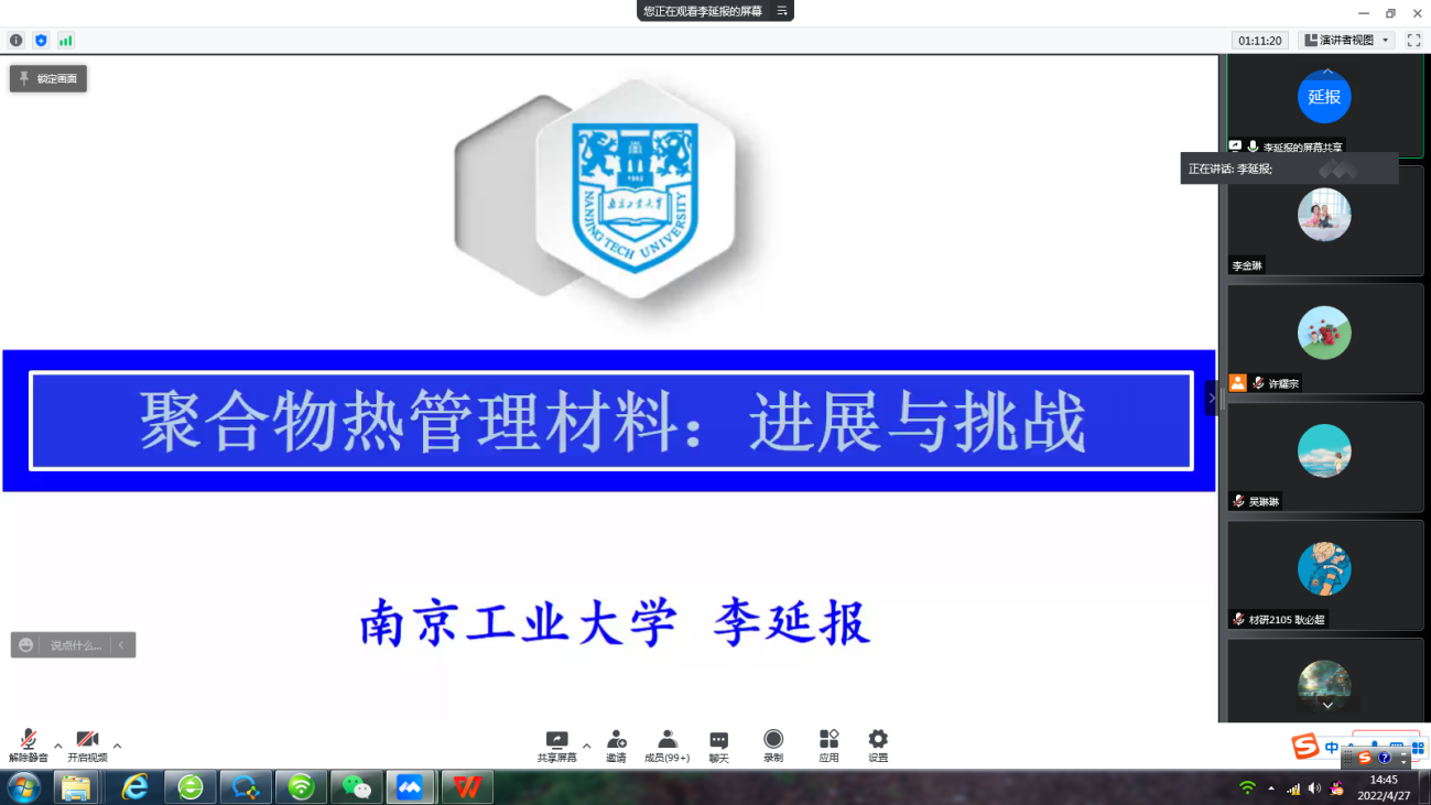 为强化师生学术交流与合作,活跃学术氛围,4月27日下午,材料学院高分子系的王庭慰教授、李延报、沈育才副教授先后为大家作了三场精彩的线上学术报告。