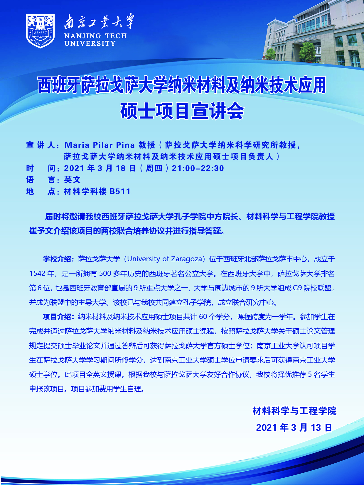 【学术报告】西班牙萨拉戈萨大学纳米材料及纳米技术应用硕士项目宣讲会