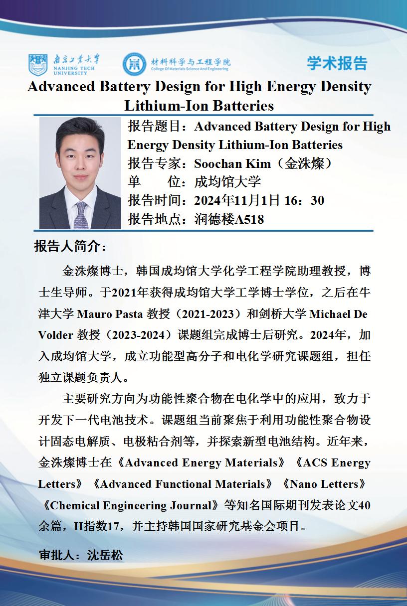 报告人简介:金洙燦博士,韩国成均馆大学化学工程学院助理教授,博士生导师。于2021年获得成均馆大学工学博士学位,之后在牛津大学 Mauro Pasta 教授(2021-2023)和剑桥大学 Michael De Volder 教授(2023-2024)课题组完成博士后研究。2024年,加入成均馆大学,成立功能型高分子和电化学研究课题组,担任独立课题负责人。