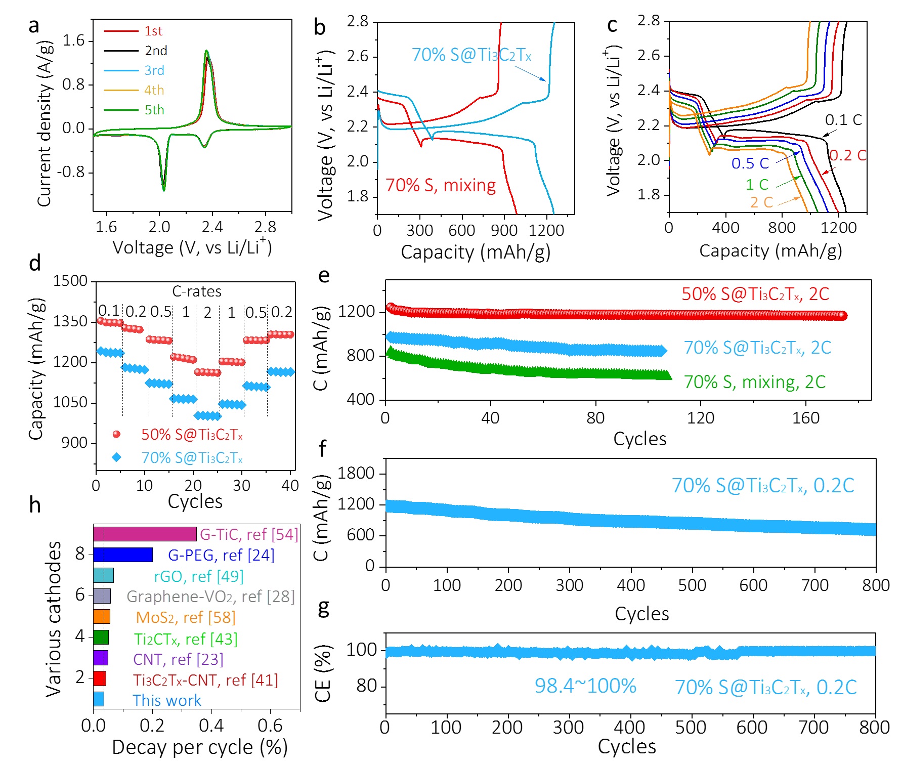 兼具优异电化学性能和出色机械性能的柔性电极是柔性储能器件开发的关键。锂硫(Li-S)电池被认为是最有可能的下一代高能量密度二次电池,但单质硫的绝缘特性和多硫化锂(Li2Sx)的穿梭效应严重限制了其未来的应用。以Ti3C2Tx为代表的MXene是一类新的二维过渡族金属碳(氮)化物家族,具有优异导电性、强极性和独特表面化学环境,是作为Li-S电池正极活性物质硫的载体用于构筑长寿命、高能量、超柔性复合正极的新型理想材料。