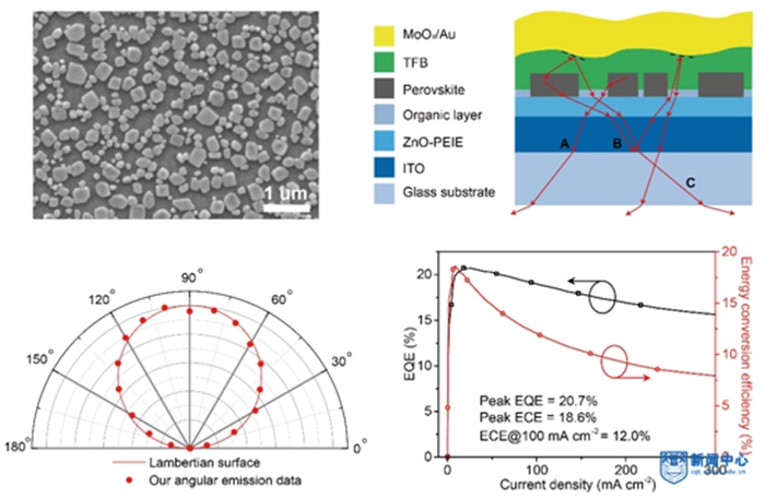 作者:海外人才缓冲基地(先进材料研究院);审核:王建浦 近日,由海外人才缓冲基地(先进材料研究院)黄维院士、王建浦教授带领的IAM团队在钙钛矿发光二极管(LED)领域再次取得重大突破。他们在世界上首次通过自发形成的具有亚微米尺度的离散型钙钛矿,使LED的光提取效率得到大幅度提升,在低成本、高亮度、大面积LED领域展现出独特的应用潜力,相关成果于10月11日发表在国际顶尖学术刊物——Nature(《自然》)上。 LED能够将电能转成光能,被称为第四代照明光源或绿色光源,在显示与照明领域应用广泛,具有广阔的市场前景以及巨大的市场价值。但是,目前平面结构的LED、尤其是有机发光二极管(OLED)的发光效率还比较低,原因在于除了约20%-30%的光子能通过折射离开器件外,其他光子都被限制在器件中,因此科学家们通常采用光提取技术来提高LED的出光效率,然而该方法需要增加图案化光栅等特殊结构,并且成本高、制备工艺复杂,往往还会造成LED发光光谱和出光方向的改变,从而影响发光效率。 针对这一世界性的重大科学难题,黄维院士、王建浦教授所带领的团队,通过一种简单的低温溶液法,实现了由一层非连续、不规则分布的钙钛矿晶粒和嵌入在钙钛矿晶粒之间的低折射率有机绝缘层组成的发光层,进而大幅度地提高了LED的光提取效率。据IAM团队学术带头人、该研究主要负责人、先进材料研究院常务副院长王建浦教授介绍,使用该方法制备的LED器件外量子效率达到20.7%,在100 mA cm-2的电流密度下能量转化效率达到12%。此外,通过与浙江大学田鹤教授、戴道锌教授团队之间的合作,他们发现该方法形成的非周期性结构可以将LED光提取效率提高10个百分点。 黄维院士指出,IAM团队作为国际上钙钛矿发光领域的开拓者之一,致力于解决钙钛矿发光器件中存在的效率和稳定性问题,继开展“钙钛矿维度调控实现高效发光”研究以来,此项研究成果再次实现了钙钛矿LED发光领域的重大突破,与目前市场上的OLED相比,所获得的器件效率大体一致,甚至在高亮度条件下的能量转化效率优于OLED,从而展现出非常广阔的应用前景。 文章链接:https://www.nature.com/articles/s41586-018-0576-2