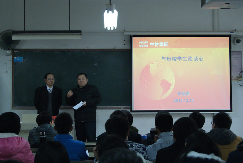 在另外一场报告会上,陈总首先介绍了中材国际的发展历程及现状。随后陈总回忆了他的大学生涯,描述了他当年在母校的学习、生活状况。他详细讲述了大学生活趣事、毕业二十周年聚会等等。陈总自毕业以来先后主持了国内20多个工程项目和遍及五大洲的海外项目,其中多个项目获国内外的奖励。报告中陈总结合印尼bayah 10000tpd生产线项目,对专业知识、行业现状和就业前景进行了分析,对大学生就业进行了指导,提出了海外发展等发展方向。最后,陈总对大学生培养责任心、创业创新等时代精神提出了殷勤期望,让在座的材料专业同学对他们自己的未来有了动力和方向。