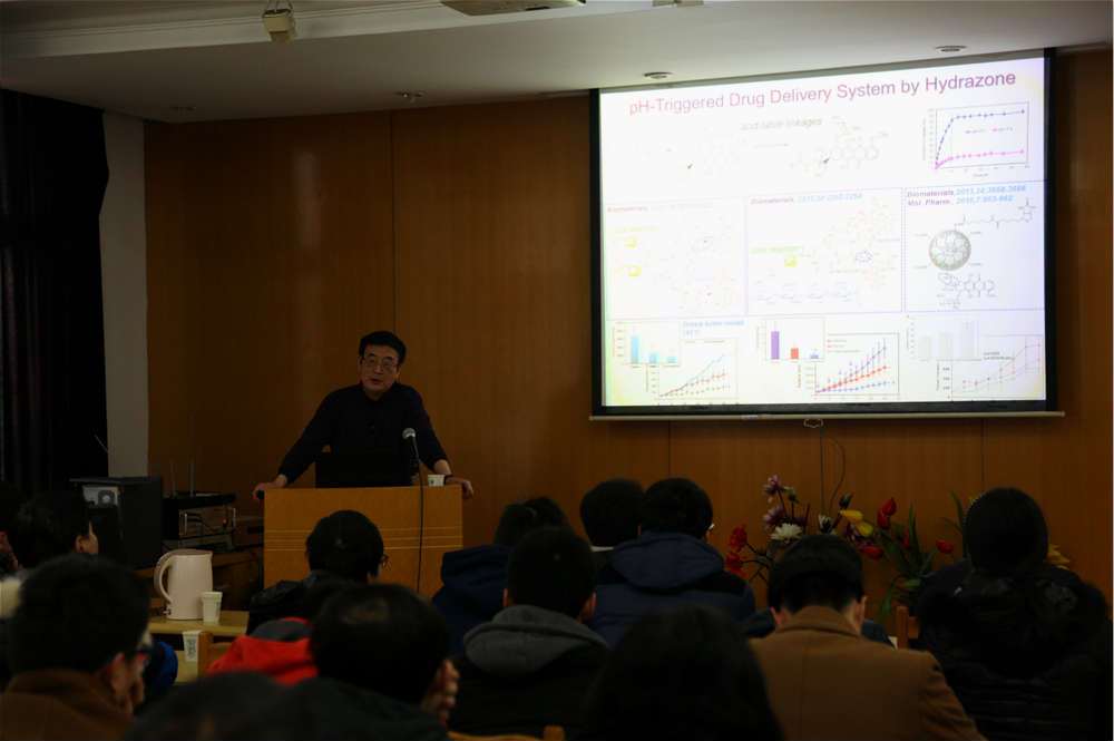2016年1月11日,学院邀请四川大学顾忠伟教授做“基于生物感知与仿生分子工程的高分子纳米递送系统”的学术报告。报告会由材料学院院长沈晓冬教授主持。 顾忠伟教授享受国家政府特殊津贴,连续三次担任国家首席科学家,获生物材料科学与工程Fellow(国家生物材料科学与工程学会联合会授予世界杰出生物材料专家终身荣誉称号)。现任教育部985工程“四川大学生物医学工程与技术科技创新平台”首席科学家、四川大学第二届学术委员会委员、中国协和医科大学中国医学科学院博士生导师;世界生物材料科学与工程学会联合会国际委员会委员、中国生物材料委员会副主席兼秘书长等;曾任国家中长期科学技术发展规划人口与健康战略研究专题组副组长,国家自然科学基金委员会工程与材料科学部专家评审组成员;先后主持国家“七.五”、“八.五”、“九.五”科技攻关、国家自然科学基金重点和面上、国家新药研究基金及国际合作项目等20余项国家级科研项目,以及10余项省级科研项目。 报告以基于生物感知与仿生分子工程的高分子纳米递送系统为主题。介绍了课题研究背景以及目前肿瘤治疗存在的难题,随后顾教授便通过自己的科研项目进行了详细的介绍。对于如何提高药物载体的透过率和靶向性进行了系统讲述,对老师同学们的提问一一解答。最后顾教授特别指出在科学研究中不能放过任何一个细节,对于异样的结果或现象要保持足够的敏锐,深挖到底。顾教授治学严谨的态度让在座的同学们钦佩不已。本次学术报告促进了学院各学科老师之间、研究生之间的交流,凝练了科研成果,活跃了学术氛围,为科研工作的进一步开展起到了积极的推动作用。