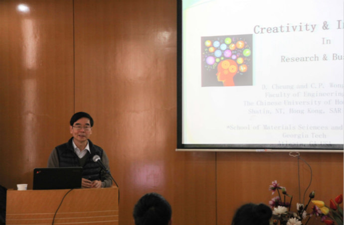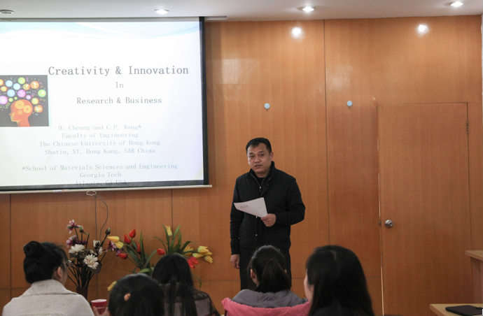 沈院长首先介绍了汪正平教授的工作经历及学术成就,并对汪教授的到来表示热烈欢迎。在1个多小时的报告中,汪正平教授主要从香港中文大学的概况、创意和创新的理解以及自身的实例三个方面阐述。汪教授指出,创意的内涵在于想象力、好奇心、新事物的发现力和接受力。对于创新,汪教授认为我们不仅要避免规则的限制、传承的制约、利益的冲突、基础的匮乏以及群体的压力;还需要满足基础知识、好的想法和勤奋工作这三个要素。汪教授通过自身实例—成功合成稀土卟啉配合物的研究经历证明了创新过程中基础知识、换角度思考和勤奋实验的重要性。此外,汪教授就老师们提出的关于环氧树脂封装材料的耐火性能,导热性能,储藏条件以及发展应用前景等相关专业性问题进行了互动交流。
