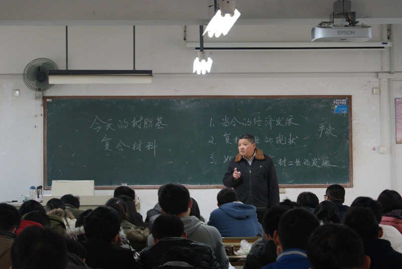 讲座伊始,王晓钧教授给在座同学讲解了复材工业的现状,并向同学们说明了复材产品,诸如树脂价平、纤维供不应求、辅材利润增长的经济特点。同时还介绍了复材行业最近迎来的“碳纤维时代”、“3D打印技术”等最新科技成就。王教授通过美国、日本、德国三个国家的例子,说明了与这些复材工业高度发达的国家相比,中国仍处于相对落后的状态,勉励同学们积极进取,树立信心,坚定理想,找准位置,热爱自己的专业,为中国复材工业的发展添砖加瓦。
