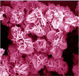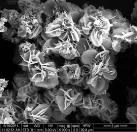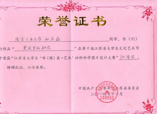 2014年11月29日,在南京理工大学举办了第十届江苏省大学生文化艺术节“江苏省大学生‘唯(微)美·艺术’材料科学图片设计大赛”。比赛要求参赛者从自己所学的材料科学中选出自己认为比较美丽的图片,经过一定的技术处理,使作品既有原结构,又具有一定的艺术性。比赛由初赛,决赛两部分组成,经过层层筛选,最后从参加比赛的将近一百幅作品中选出40幅比较优秀的作品进入决赛。 参赛作品材料来源于孙庆磊做本科毕业论文期间制备一种材料的扫描电子显微镜图片,叫做MgAl-LDH/ZnFe2O4,此材料以生物原料花粉为模板,制备出具有花粉形貌的ZnFe2O4。将ZnFe2O4浸入到硫酸镁、硝酸铝溶液中,通过超声、反应、煅烧、烘干,得出MgAl-LDH/ZnFe2O4材料。其中,LDH为layered double hydroxide,双层氢氧化物,即双层氢氧化镁,氢氧化铝结构。此材料具有良好的吸附性能,可以较好地解决环境当中的染料废水问题。 通过作品原图可以看出,许多白色层片状氢氧化物比较良好的附着在黑色的ZnFe2O4上面,像黑夜里的一片片美丽白色的桃花瓣。PS创意是将白色层片状物质改成红色,许多红色的的桃花瓣合成一个小圆脸,花瓣上那许多纤细的花蕊,顶着一粒粒淡红色的小圆点,像美丽的桃花,花蕊那样,在黑暗中看上去非常动人,绚丽多彩。