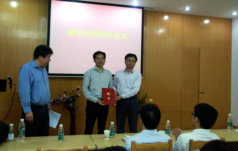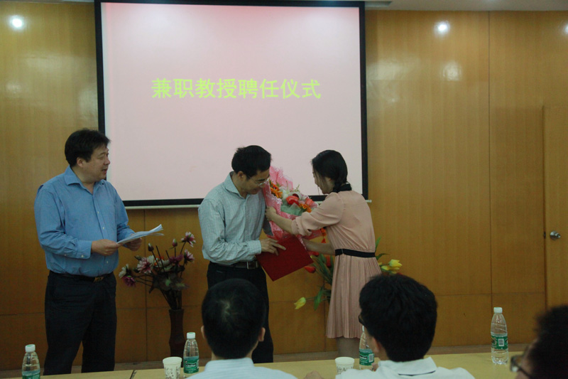 在聘任仪式上,材料学院副院长王庭慰教授介绍了王士维教授的简历及其在陶瓷基复合材料、高热导氮化铝、透明与发光以及陶瓷成型新方法等领域取得的丰硕成果。人才资源部部长董军教授为王士维教授颁发兼职教授聘书,学生代表为王士维教授佩戴校徽、并献花。