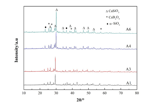近日,江苏先进无机功能复合材料协同创新中心智能电子材料团队在微晶玻璃方向取得重要研究进展。该论文以CaO-B2O3-SiO2 (CBS)微晶玻璃为主要研究对象,通过改变和优化三元组分,观察不同组分情况下微晶玻璃的结构、烧结性能和介电性能。研究发现当B2O3含量为15 mol%时,Ca/Si比在0.61 ~ 0.62范围内,微晶玻璃可呈现透明状态且在850℃以下可实现烧结致密化;当Ca/Si比< 0.61时,Ca2+含量相对较小,Si4+含量较高,容易形成富硅相,导致微晶玻璃失透;当Ca/Si比> 0.61时,Ca2+含量增加,高温熔体粘度降低,促进结晶,导致微晶玻璃失透。最后,确定该材料组分中Ca/Si比为0.61,发现随着B2O3含量的增加,玻璃陶瓷的透明度越来越差且烧结温度被提高,通过X射线衍射分析,认为微晶玻璃介电常数的提高是由于玻璃相CaB2O4晶相增多。该研究对微晶玻璃在不同三元组分下的性能进行了深入分析,对微晶玻璃设计具有重要的理论指导作用。