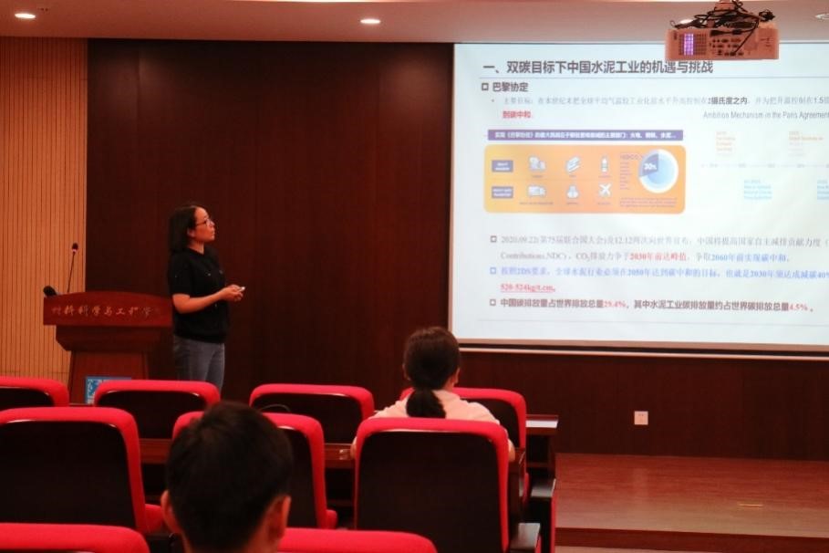 首先,马素花教授作了以“水泥工业低碳技术途径探讨”为主题的报告,从双碳目标出发分析目前水泥工业的机遇和挑战,围绕水泥工业的低碳化,重点介绍水泥工业面临的现状问题、可采取的技术途径和典型大型水泥企业低碳化案例和研究机构的研究热点等内容。