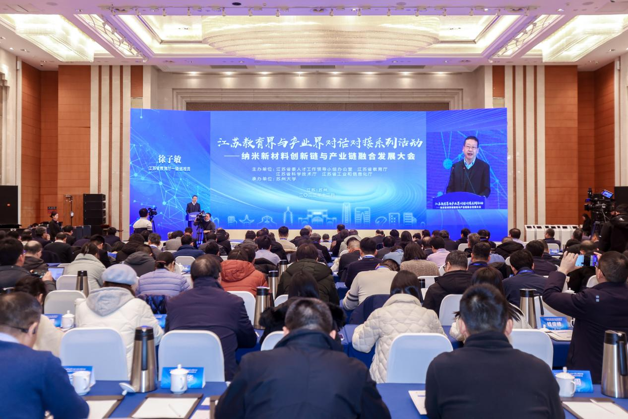 12月23日,江苏教育界与产业界对话对接系列活动——纳米新材料创新链与产业链融合发展大会在苏州召开。省教育厅厅长江涌,苏州大学党委书记张晓宏,副市长季晶,省内各高校协同创新中心牵头建设高校负责人、各协同创新中心负责人及主要协同单位代表,产业界、金融界代表等300余人参加会议。我校副校长郭凯,自然科学处副处长王宇翔,江苏先进无机功能复合材料协同创新中心沈晓冬教授等相关负责人参加了此次会议。