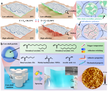 对此,我中心郑严博士/陈双俊教授团队与南京大学周东山教授合作设计了一种可涂覆的热触发可切换粘合剂,它在皮肤温度(如33°C)下具有68.8 N/m的高粘合力,在轻微冷却(如20°C)后,粘合力降至6.59 N/m,从而实现10.4的高切换比。切换时间小于1 min。这种独特的性能是通过构建核壳粒子的策略,将侧链结晶聚合物和自粘性聚合物结合在一起而实现的。热分析、流变学和固体核磁共振的结果表明,材料内部快速、可逆的结晶-熔化转变是粘附切换的关键。通过使用喷涂技术将该材料沉积在柔性电极上,该团队获得了一种超薄(<5 μm)、可按需剥离的表皮电极,证明了乳液材料在制备穿戴舒适的表皮电子器件方面的优势。论文第一作者为陈双俊教授团队的郑严博士,论文题目为“Skin Temperature-Triggered Switchable Adhesive Coatings for Wearing Comfortable Epidermal Electronics”,发表于期刊《Chemical Engineering Journal》,此外,南京大学化学化工学院王晓亮教授为该论文的共同通讯作者。