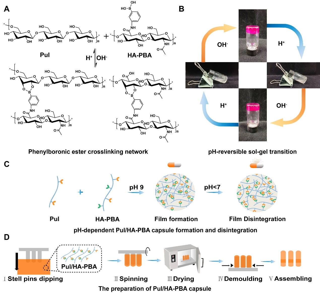 针对这一领域,tyc234cc 太阳成集团何一燕教授、周廉院士与江苏力凡胶囊有限公司刘培勇高级工程师展开合作研究,成功开发了一种基于普鲁兰多糖(Pullulan)和苯硼酸功能化透明质酸(HA-PBA)的新型水溶性薄膜,用于制备快速崩解硬胶囊。该体系创新性地利用苯硼酸酯交联网络实现可逆的溶胶-凝胶转变,从而显著增强了胶囊在胃肠道环境中的快速崩解和溶解性能。实验结果表明,HA-PBA的引入赋予薄膜优异的综合性能,包括高透明度(>90%)、适宜的水接触角(68.2°)、良好的拉伸强度(71 MPa)和断裂伸长率(32.3%)。此外,该体系制备的胶囊在不同pH条件下均表现出优异的溶解性能,尤其在胃液环境中,其崩解时间显著短于传统的明胶胶囊和普鲁兰胶囊,能够实现药物的快速释放。本研究通过将苯硼酸功能化透明质酸(HA-PBA)作为胶凝剂,成功开发了具有快速崩解性能的普鲁兰-透明质酸水溶性薄膜和硬胶囊。该研究成果为制药行业提供了新型药物递送系统,在需要快速药物释放的场合具有广阔的应用前景。