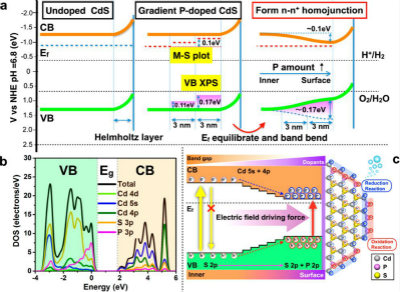 为了克服载流子在半导体催化剂体相复合导致的能量转换效率低下的缺点,近期,协同创新中心光电功能材料课题组陆春华教授团队与澳大利亚昆士兰大学王连洲教授团队合作,报道了一种通过表面梯度扩散掺杂方法制备的非均匀磷掺杂的硫化镉纳米棒光催化剂。结合DFT理论计算和实验测试分析,解析出该光催化剂具有梯度分布的掺杂元素,这种掺杂剂的梯度分布诱导了光激发下催化剂能带的弯曲,进而形成了具有驱动载流子迁移至材料表面的定向电场。这种特殊的能带结构分布具有与“量子阱”相反的特征,因此我们将其命名为“反量子阱”能带结构。这种特殊的能带结构克服了一般无序掺杂易导致载流子在缺陷处复合的缺点,在没有助催化剂的条件下,该材料在可见光下的产氢速率高达194.3 𝝁mol h-1 mg-1,产氢速率是未掺杂样品的58.3倍,并且在420 nm的产氢量子效率达到了8.2%。该研究揭示的内建定向电场的作用机制有助于指导其他高性能半导体光催化剂的开发。